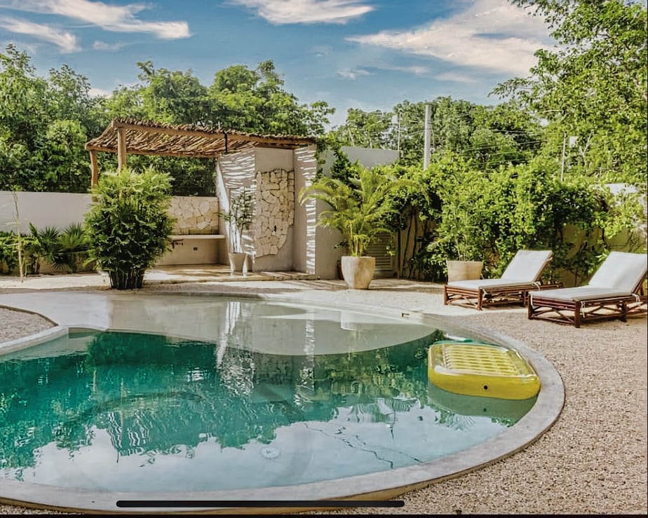 Casa Nómade is a 1600 sq ft / 140 sq mt boho-chic hideaway in La Veleta, tucked in a quiet boutique gated community near vibrant Calle 7. Unwind in your private jungle garden, a refreshing plunge pool with water cascade, and a built-in lounge for shaded afternoons. Inside, spacious areas meet handcrafted indigenous design. Enjoy a king bed, indulgent Yucatán Senses bath products, and high-speed Wi-Fi.
