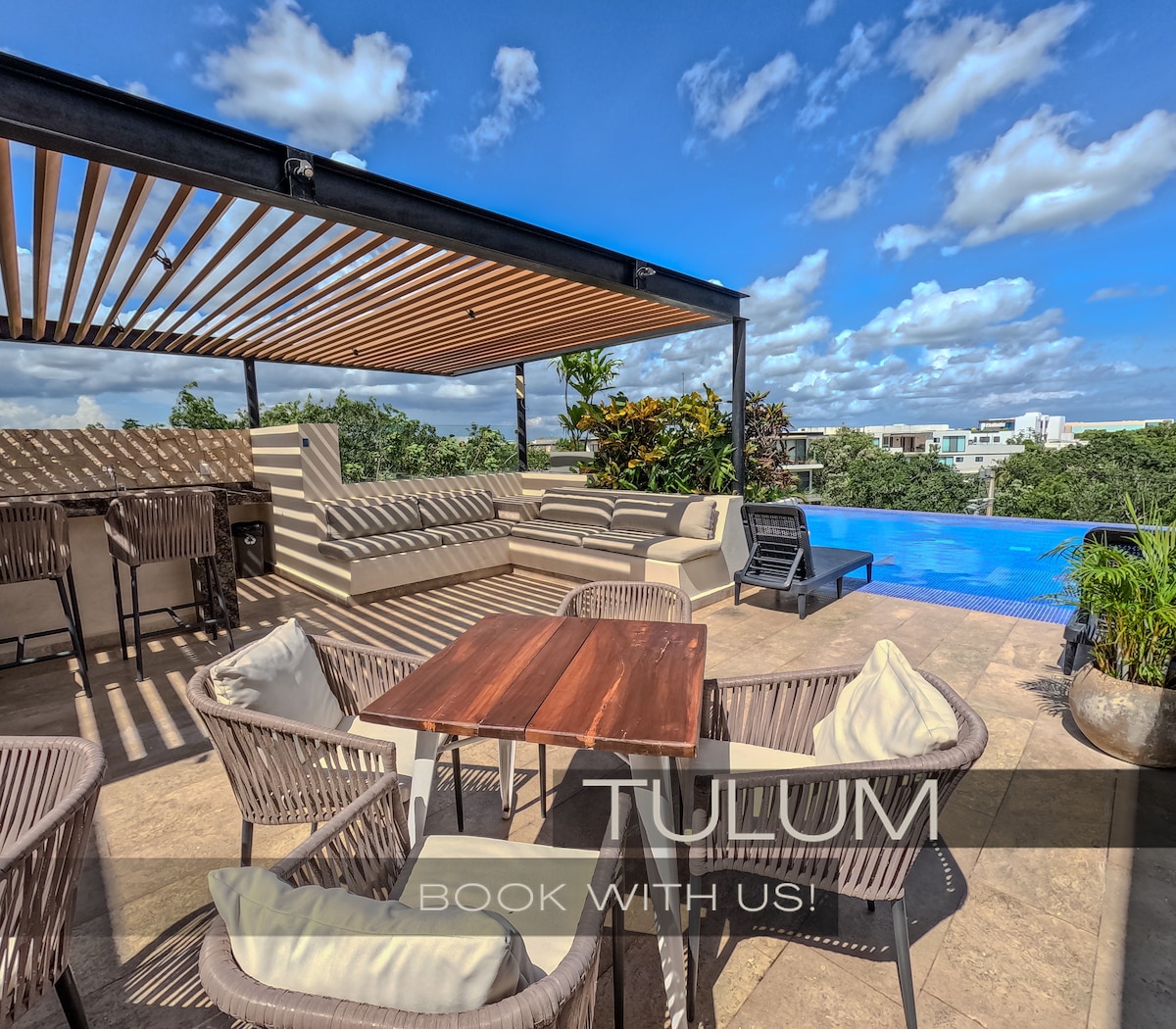 Kaxil 2BR Luxury Apt · Terraza jardín + piscinas