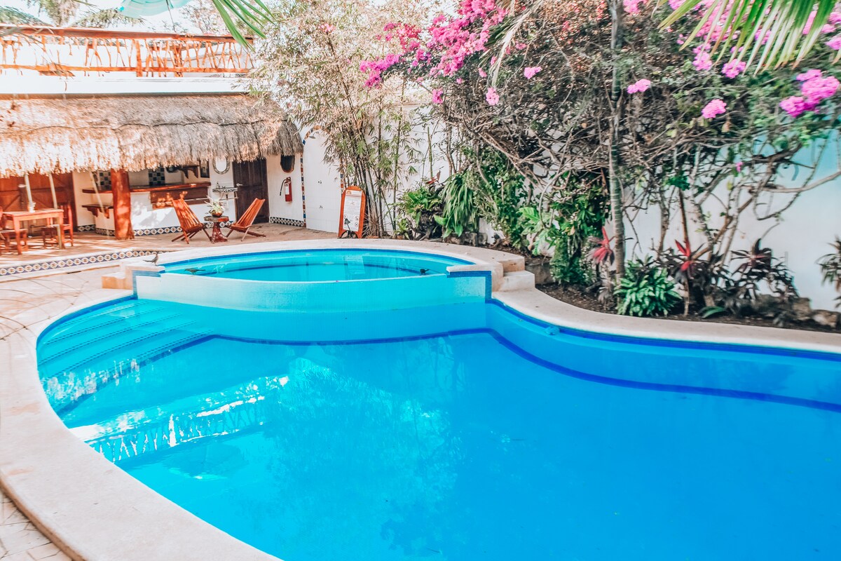 Este departamento es una verdadera experiencia, situado entre la selva, y cerca de todo al mismo tiempo. Tendrás bicicletas para que puedas llegar en 5 minutos al centro y en 20 a boca Paila zona famosa por sus restaurantes, clubs de playa y tiendas tuluminati. Si lo que quieres es privacidad, este es el lugar, tienes todo para disfrutar, relajarte y encontrar paz. En el roof tendrás oportunidad de tomar sol, leer bajo la sombra, relajarte en el jacuzzi o hacer una parrillada. Inmejorable"