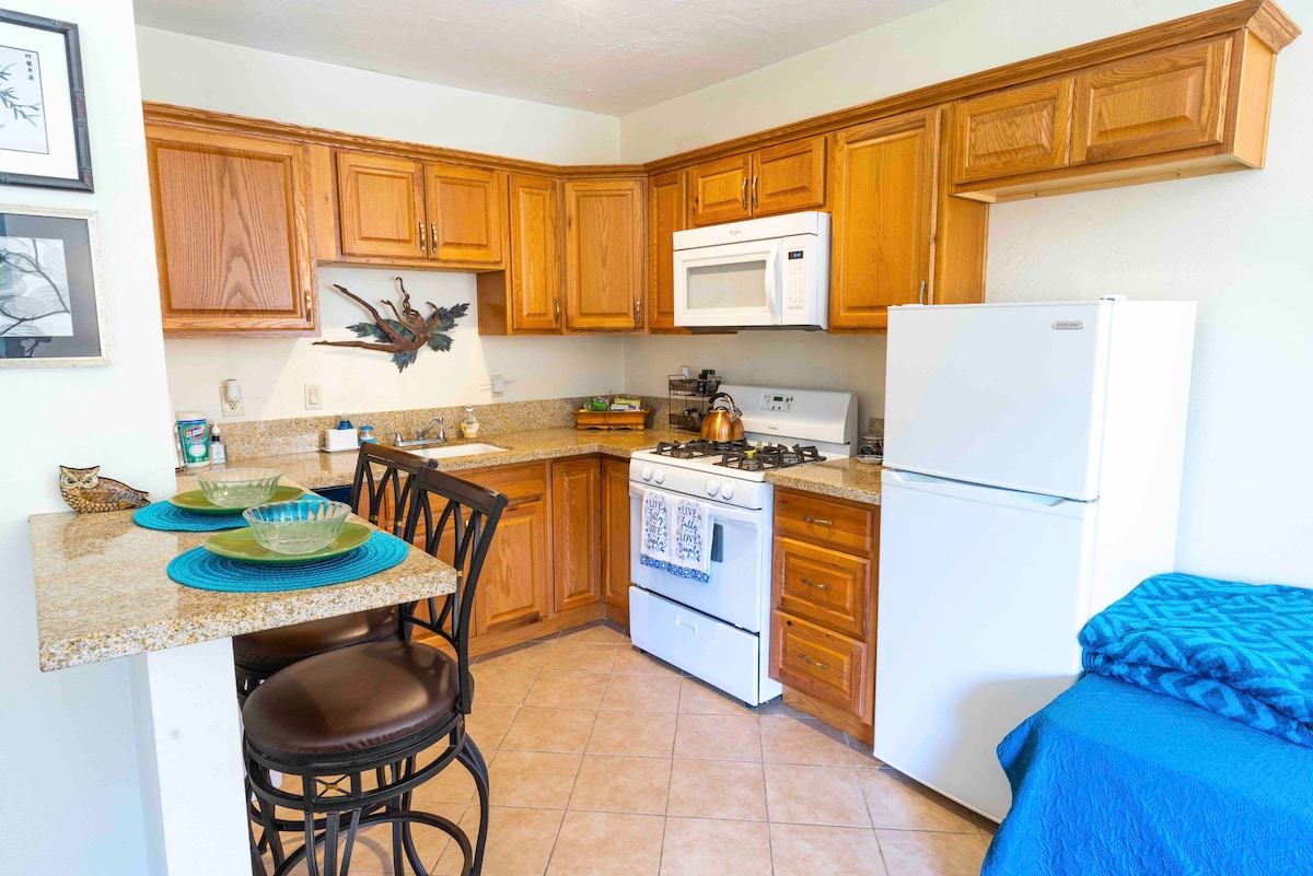 Acogedora suite privada para huéspedes en un gran barrio con entrada privada a la unidad. Estudio de 1 dormitorio con cama tamaño queen. El futón también está disponible en el estudio para una tercera persona. La cocina americana cuenta con nevera, cafetera y microondas. Junto con platos y vasos desechables. El baño está equipado con papel higiénico, toallas, champú y jabón. Se proporciona una plancha y un secador de pelo para tu uso. La zona de invitados es privada con patio privado propio. Se te proporciona un aparcamiento fuera de la calle.