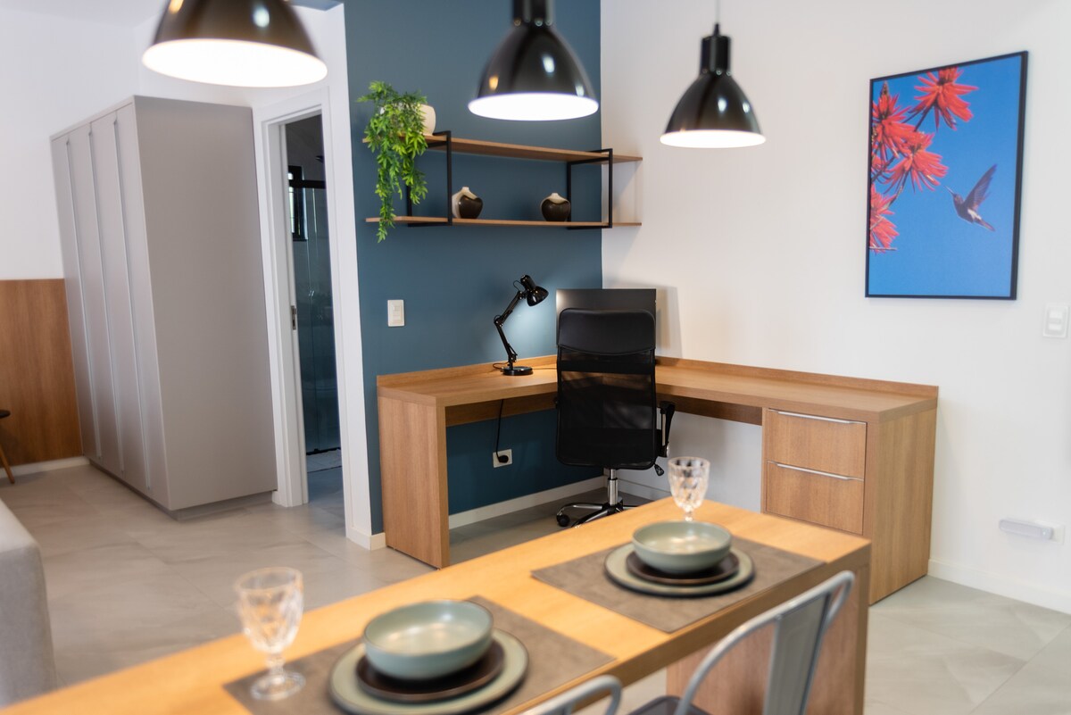 Loft moderno, muy nuevo, acogedor, con cocina completa y muy bien equipada. 2 baños y 2 aires acondicionados, cama nueva con ropa de cama impecable, además de sofá cama cómodo. Cerca de las mejores playas de Florianópolis (a 1,5 km de la playa más cercana) y con una piscina en la terraza espectacular. A solo 1 km del centro de Morro das Pedras (restaurantes, música en vivo, heladerías, mercado, farmacia...). Techo alto, confort y sofisticación. Tu lugar en Floripa.