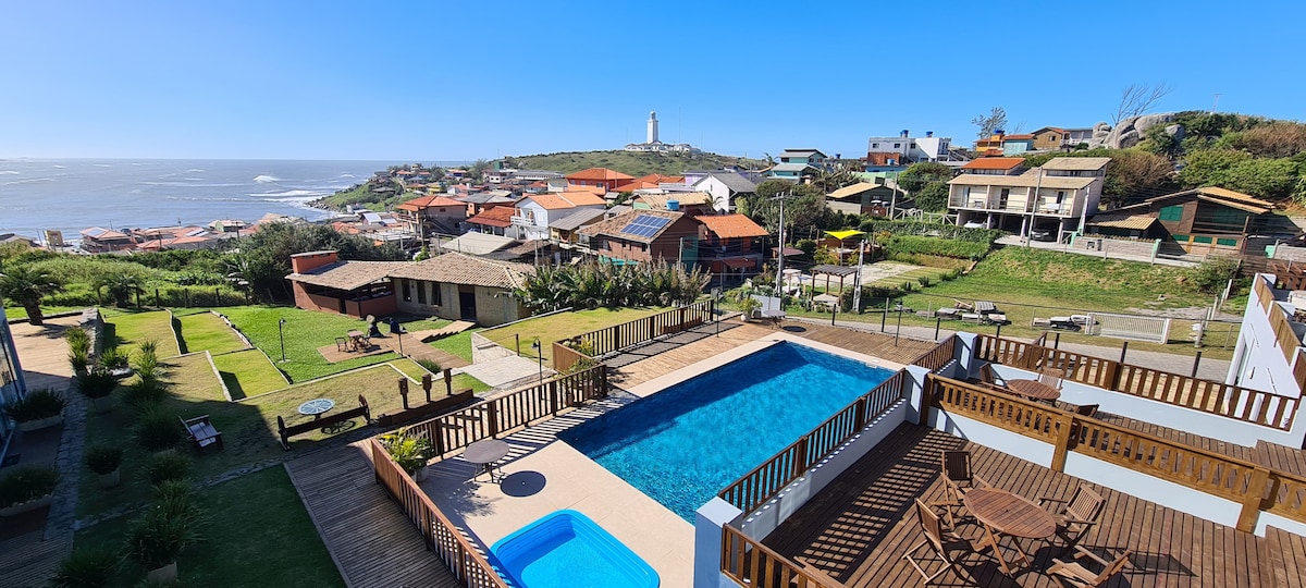 Loft con vistas panorámicas al faro y a la playa de Cardoso. Tiene una cama tamaño queen, cocina pequeña equipada,estufa,nevera . Baño. Además de otras comodidades como sandwichera,licuadora y otros utensilios domésticos para que disfrutes más de tu estancia. Wifi en toda la estructura. Tiene un ascensor panorámico y accesibilidad. En Prainha, también tenemos un corto sendero a lo largo de la costa del mar, ¡con una vista espléndida!