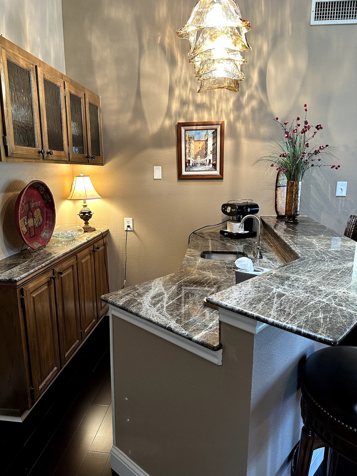 Tal vez soy un poco parcial, pero realmente tengo que pellizcarme cuando voy a visitar la casa de campo de Callie. Imagina... un hermoso camino rural, tranquilo excepto por el sonido ocasional de una vaca. Una casa de campo escondida entre una gran cantidad de árboles, envuelta por un porche, una zona de fogata de losa, luces de patio colgadas por el patio, una chimenea antigua con fuego de gas, una lámpara de araña de cristal, un tablero de cuentas de una granja de 1800, una bañera lo suficientemente grande para dos, la ropa de cama más lujosa, música clásica, dulces servidos. Suspiro profundo.