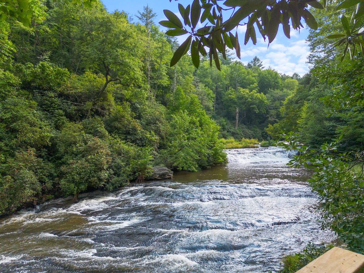 This cabin-like home is nestled on a hill beside a 250 foot waterfall. As the water cascades to the bottom it turns into a creek that wraps around the property. The waterfall and can be enjoyed from almost every room. The elevation is at 3800 ft providing perfect temperatures for most of the summer, hence, no air conditioning. There is a fully stocked, renovated kitchen and washer/dryer upstairs. The house is located 15 minutes from Cashiers which has restaurants and groceries.