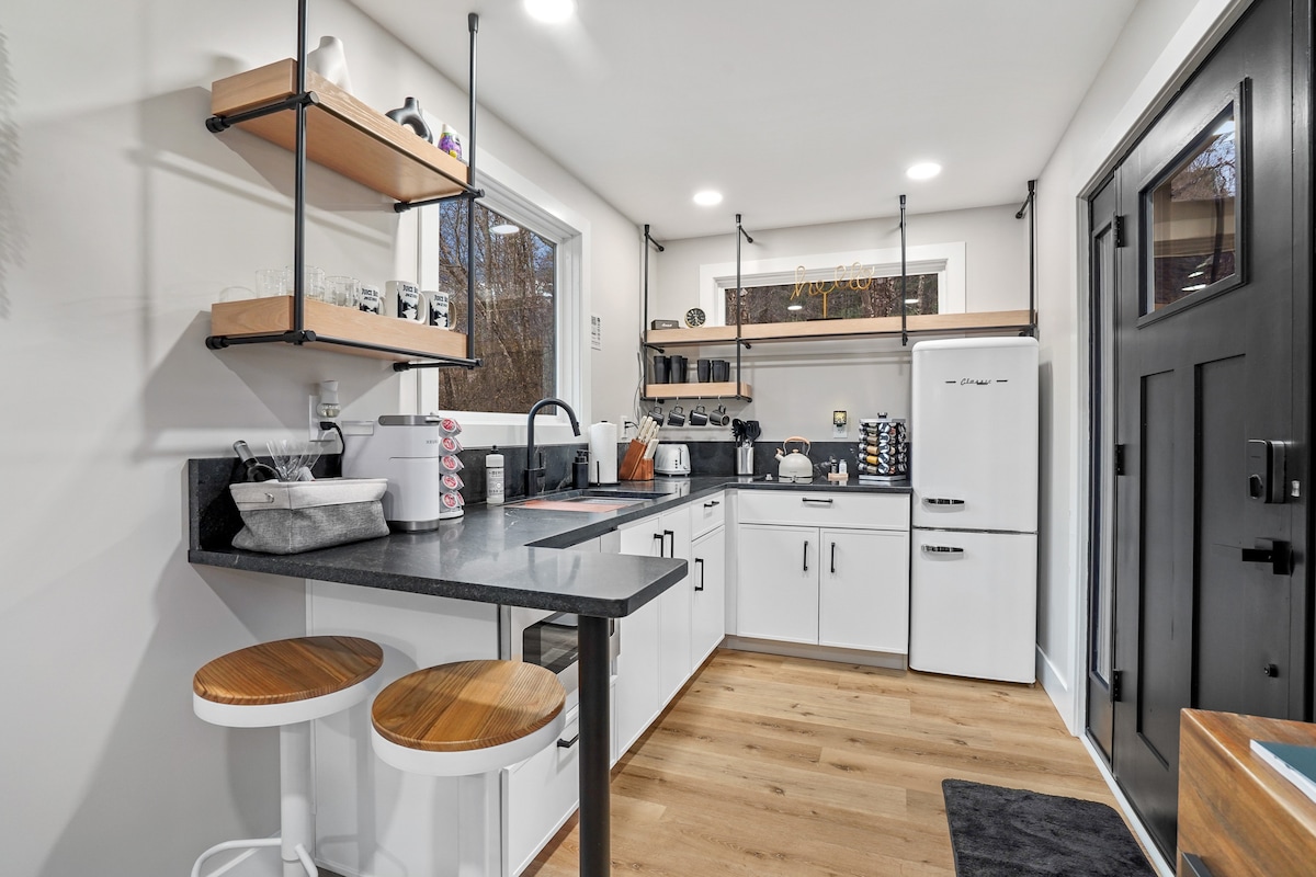 Bienvenido a The Nest de ReWild Rentals. Escápate a esta lujosa cabaña diminuta ubicada entre los árboles, una mezcla perfecta de diseño moderno y naturaleza. Cuidadosamente diseñado para parejas o viajeros solitarios, este acogedor refugio tiene todo lo necesario para una escapada relajante. Lo que te encantará: - Bañera de hidromasaje privada. - Ducha de efecto lluvia y bañera de inmersión. - Dormitorio cerrado con cama tamaño king - Cocina completa (incluye lavavajillas, máquina de hielo y microondas) - Acogedora chimenea de gas. -Cubierta cubierta + chimenea - Ubicación céntrica