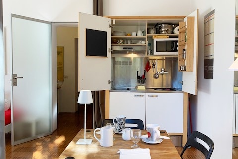 Este acogedor estudio, disponible en diseño Smokey Nordic o Rusty Green, está cuidadosamente equipado con todo lo esencial. Cuenta con una cómoda cama doble, TV de pantalla plana y cocina americana totalmente equipada con microondas, cafetera, estufa vitrocerámica, lavavajillas y un juego completo de utensilios de cocina. El baño separado incluye una ducha, toallas de mano, un secador de pelo y artículos de tocador de marca para cubrir las necesidades diarias. Las cortinas y un sistema de intercomunicación garantizan la privacidad.
