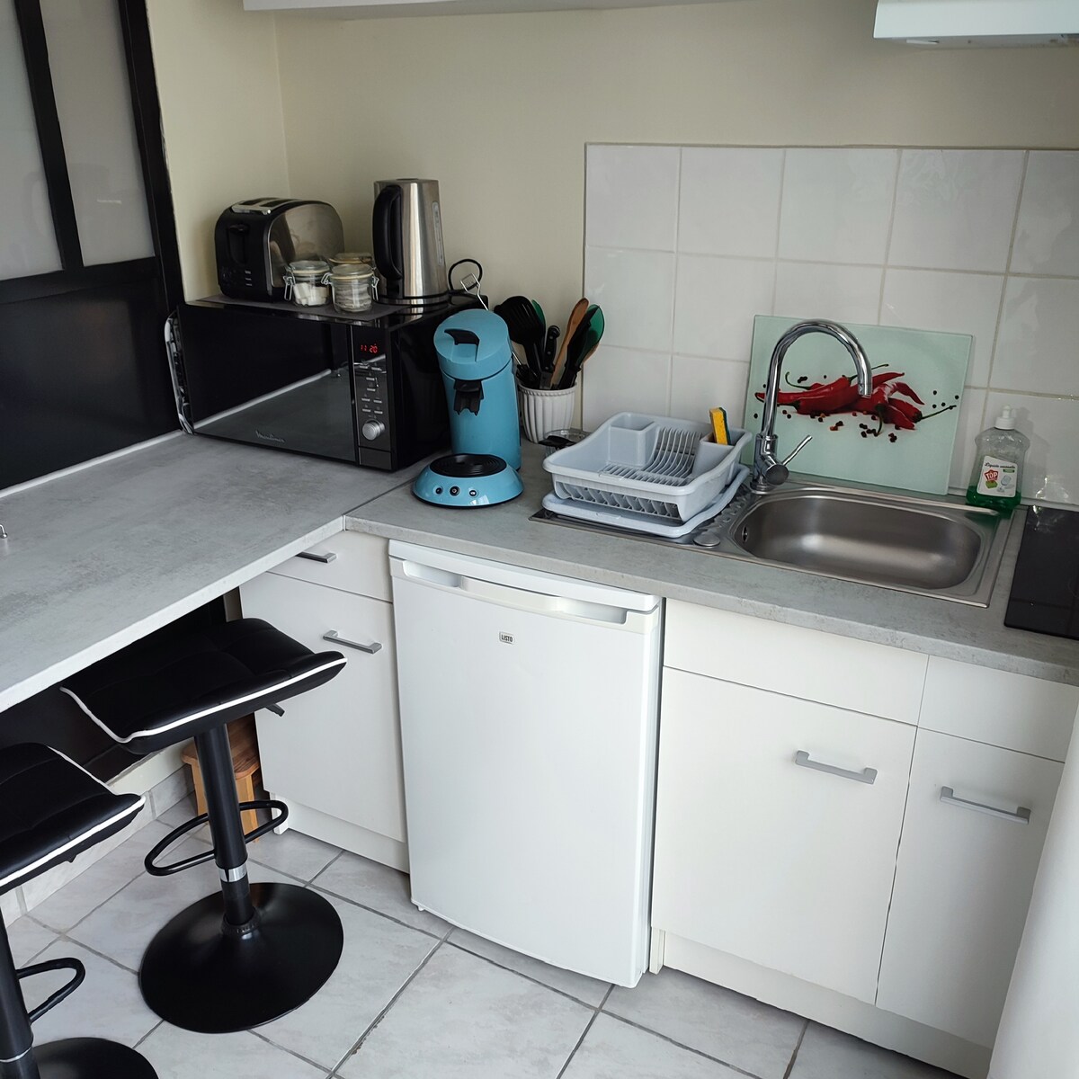 Encantador apartamento luminoso renovado en el primer piso de una casa en el fondo del patio PARA NO FUMADORES en el interior. Planta baja sala de estar de 26 m2 con cocina totalmente equipada y baño, arriba un dormitorio abuhardillado de 25 m2 con vistas a las montañas por el velux y 1 plaza de aparcamiento gratuita en nuestro patio sin vistas de la calle (3er lugar en el patio) Ayuntamiento de Tarbes a 2 km 500, Caminadour a 500 m, tienda a unos 1 km Vivimos al lado y a su disposición para satisfacer sus expectativas