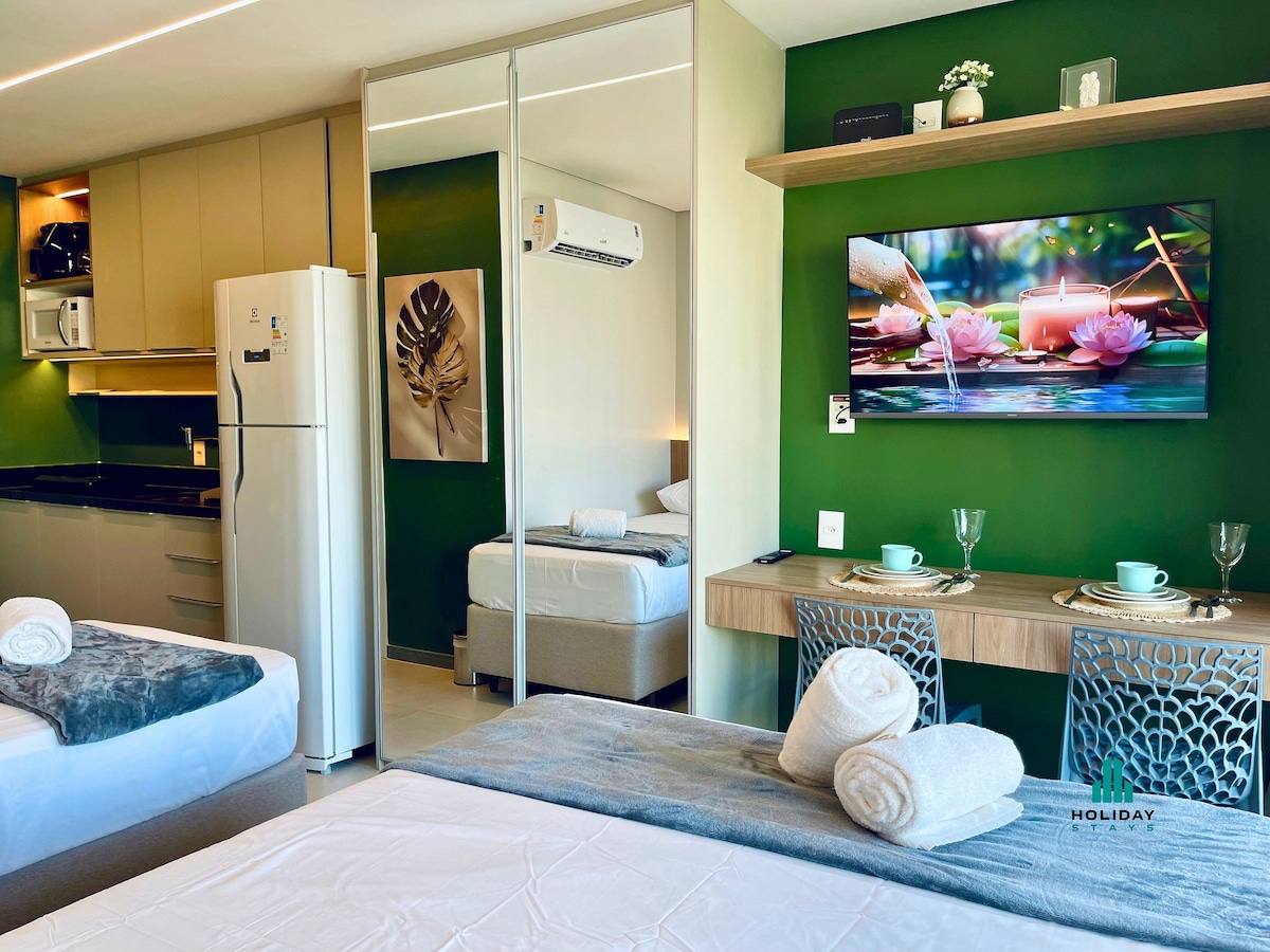 Estudio decorado con un alto nivel y diseñado para estancias cortas o largas. Ideal para parejas o viajeros solitarios, ya sea por ocio o trabajo. Tiene capacidad para 2 personas con todas las comodidades necesarias. Situado a solo 600 metros del paseo marítimo, en una calle tranquila y apacible. Todo cerca: mercados, farmacias, cafés y restaurantes a 10 minutos en auto. Disfruta de la mejor relación calidad-precio para alojarte cerca de uno de los paseos marítimos más hermosos de Brasil, con fácil acceso a las principales áreas de la ciudad.