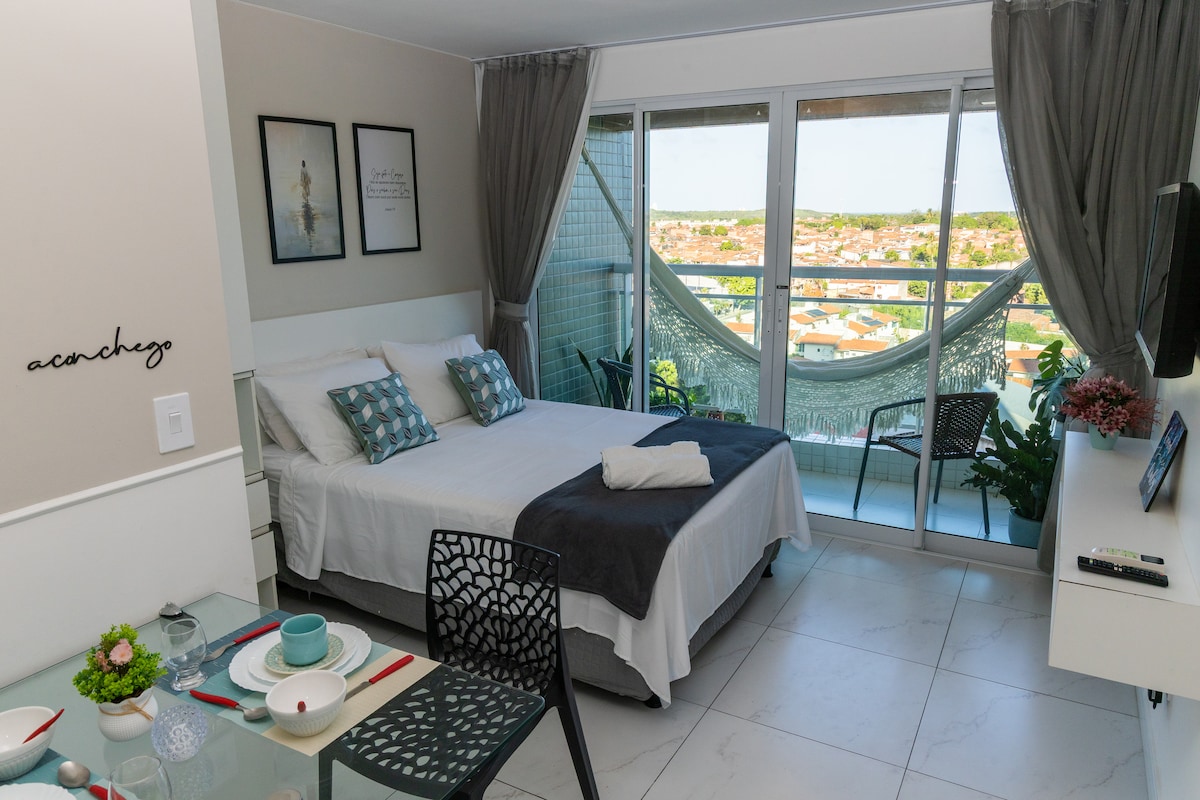 STUDIO COM UM ROOFTOP ESPETACULAR Planejado para oferecer uma estadia prática e aconchegante para clientes exigentes. -Cama de casal QUEEN Premium e enxoval. -TV 58” e canais a cabo com Filmes e Premiere para não perder os Jogos de seu time. -Cozinha com Cafeteira a cápsula Fogão,Microondas,Geladeira Duplex,Sanduicheira,Liquidificador,Purificador de Água Gelada, Ayrfrier; -Banheiro Moderno com Ducha de Água Quente revigorante, Secador de Cabelo. -Varanda com Mesa e cadeiras confortáveis.