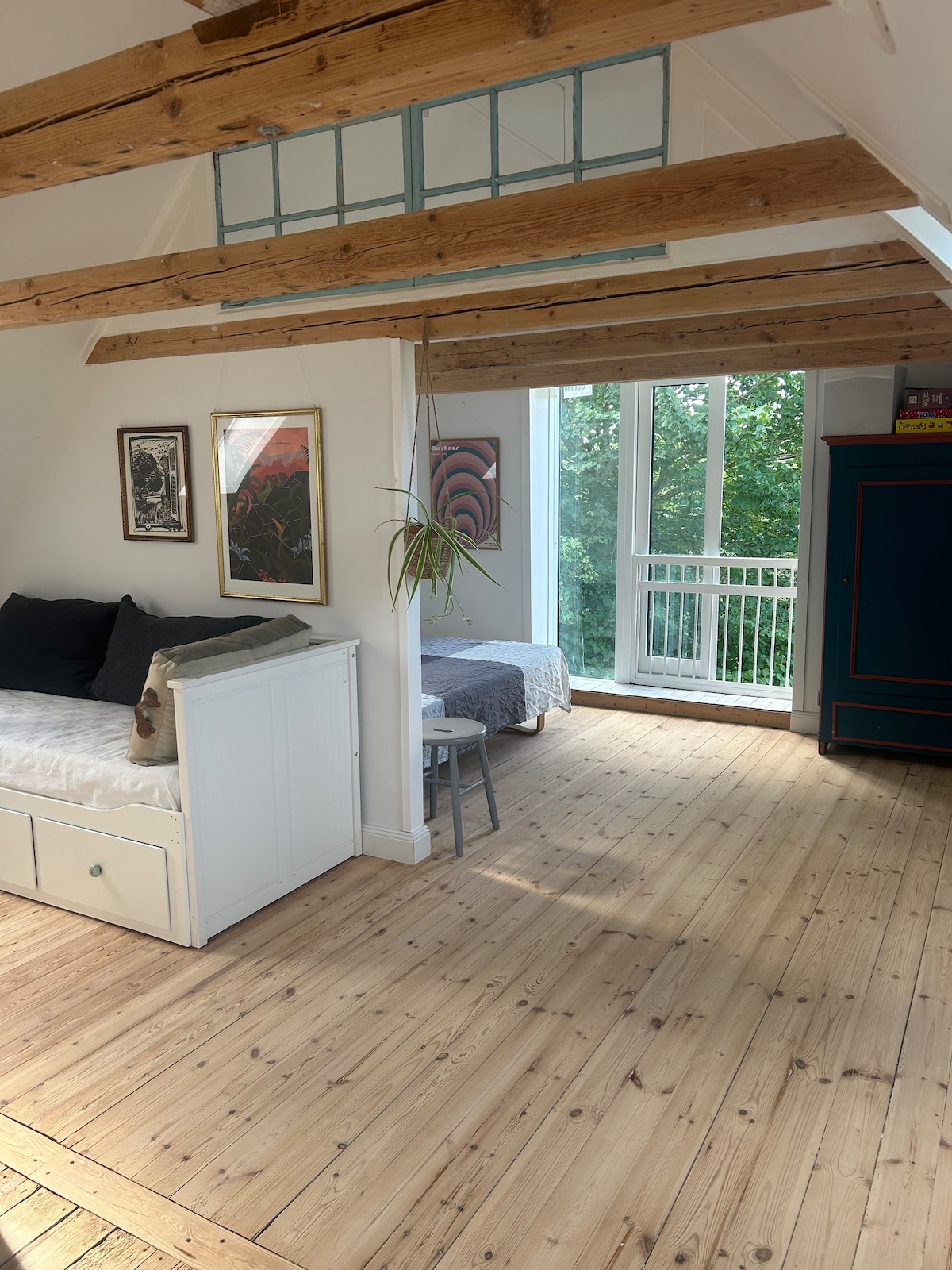 Acogedor anexo de 30 m2, situado en un lugar precioso cerca del lago Ollerup. Construido en 2022 con paredes de ladrillo en bruto y techos de madera, lo que le da un ambiente muy especial. Ideal para 2 personas o una familia pequeña. Cama de 140x200 cm en el salón, así como un altillo con capacidad para dos huéspedes adicionales. (2 colchones individuales) No hay altura de pie en el altillo. Hay una entrada privada, terraza de madera y acceso al lago Ollerup. Check-in a partir de las 16:00 Salida antes de las 12:00 Pregunte si los horarios no son adecuados.