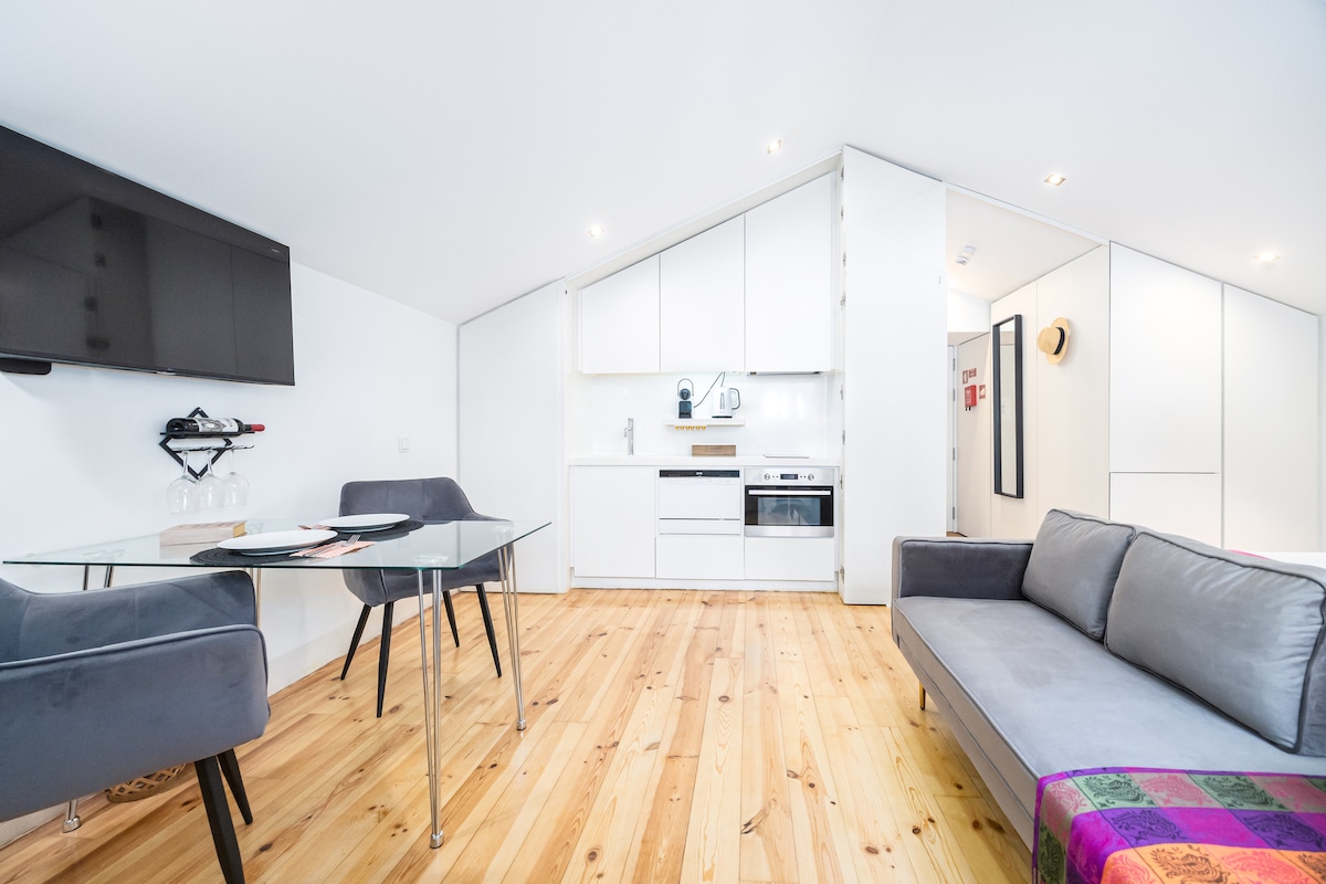 Departamento tipo estudio boutique con una cama tamaño king muy cómoda, sábanas blancas suaves y almohadas de lujo. Aire acondicionado, cocina totalmente equipada, baño de mármol con toallas de primera calidad, así como lavadora y secadora. Zona animada con muchos restaurantes, tiendas y cafés. Justo en la histórica línea de tranvía E28 🚋 y a poca distancia a pie de Chiado, Bairro Alto y Cais do Sodré. El edificio tiene ascensor y el transporte es fácil. 📶 Wi-Fi gratis 📺 Televisor inteligente ☕ Café Nespresso y té de cortesía