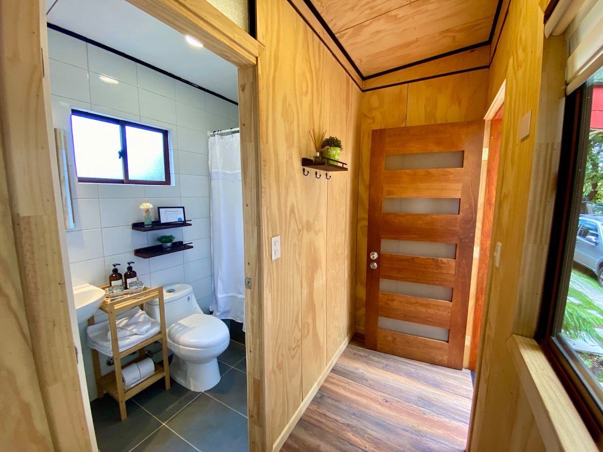 Acogedora cabaña en Valdivia para 2 a 3 personas. Primer piso con cocina, comedor, baño y estar con sofá-cama 1p. Segundo piso dormitorio con cama 2p premium nueva. Amplio patio compartido con estacionamiento privado. A minutos del centro y a dos cuadras de avenida con abundante comercio: supermercado, farmacia, minimarket, etc. Orientación 24/7 para el huésped. * No mascotas