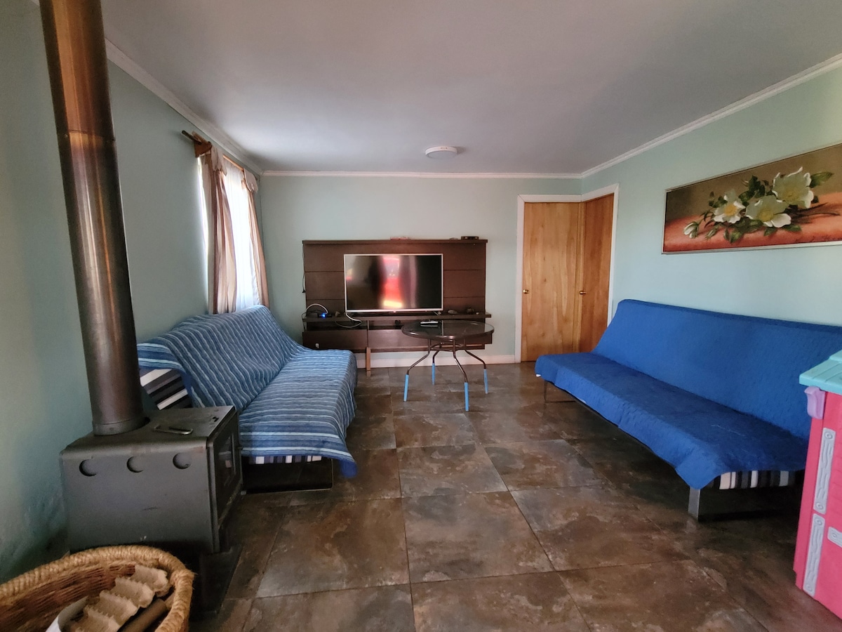 Relájate con toda la familia en este tranquilo lugar rodeado de naturaleza con salida directa al lago, sin embargo, en temporada baja el nivel del lago baja mucho y el muelle se seca. Ideal para 11 personas . 3 dormitorios y 2 baños recién remodelados. Piezas con cortinas Black out. Taca taca. Parlante Karaoke. Smart TV. Gran Arcade 12mil juegos con Rockola 3mil canciones. 1 cama king. 1 cama 2 plazas. 2 camas de 1 plaza y 5 camas de 1 1/2 plaza. Disponibles 2 kayak. Minimarket a 5 min en auto.