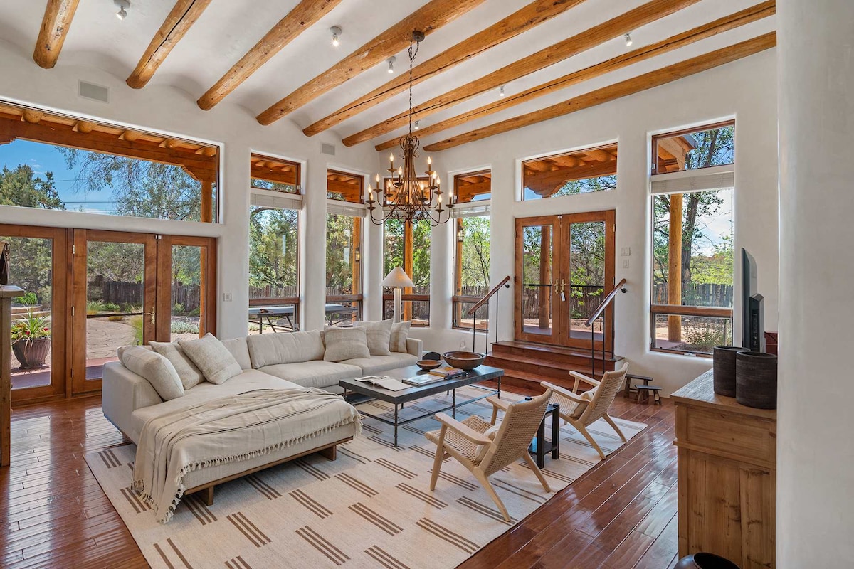 Welcome to your home away from home! Peaceful, spacious, (2100 sqft) private home on secluded 5 acre compound in beautiful Tesuque. Conveniently located just 9 miles from downtown Santa Fe. This beautiful adobe home has two large bedrooms, two bathrooms, and a fully stocked open concept kitchen. The home exudes Santa Fe charm with vigas throughout, Saltillo tile, functional kiva fireplace, and ample windows for natural lighting. Private outdoor patio and access to breathtaking views from gazebo