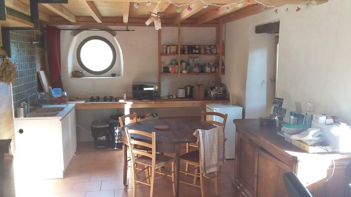Un nido para relajarse en las Cévennes. Tranquilo, rodeado de naturaleza, se puede disfrutar del sol en la terraza o relajarse junto a la estufa durante la temporada de invierno. Fabricada con materiales naturales y ecológicos, nuestra cabaña tiene todas las comodidades necesarias a la vez que autónoma en electricidad.