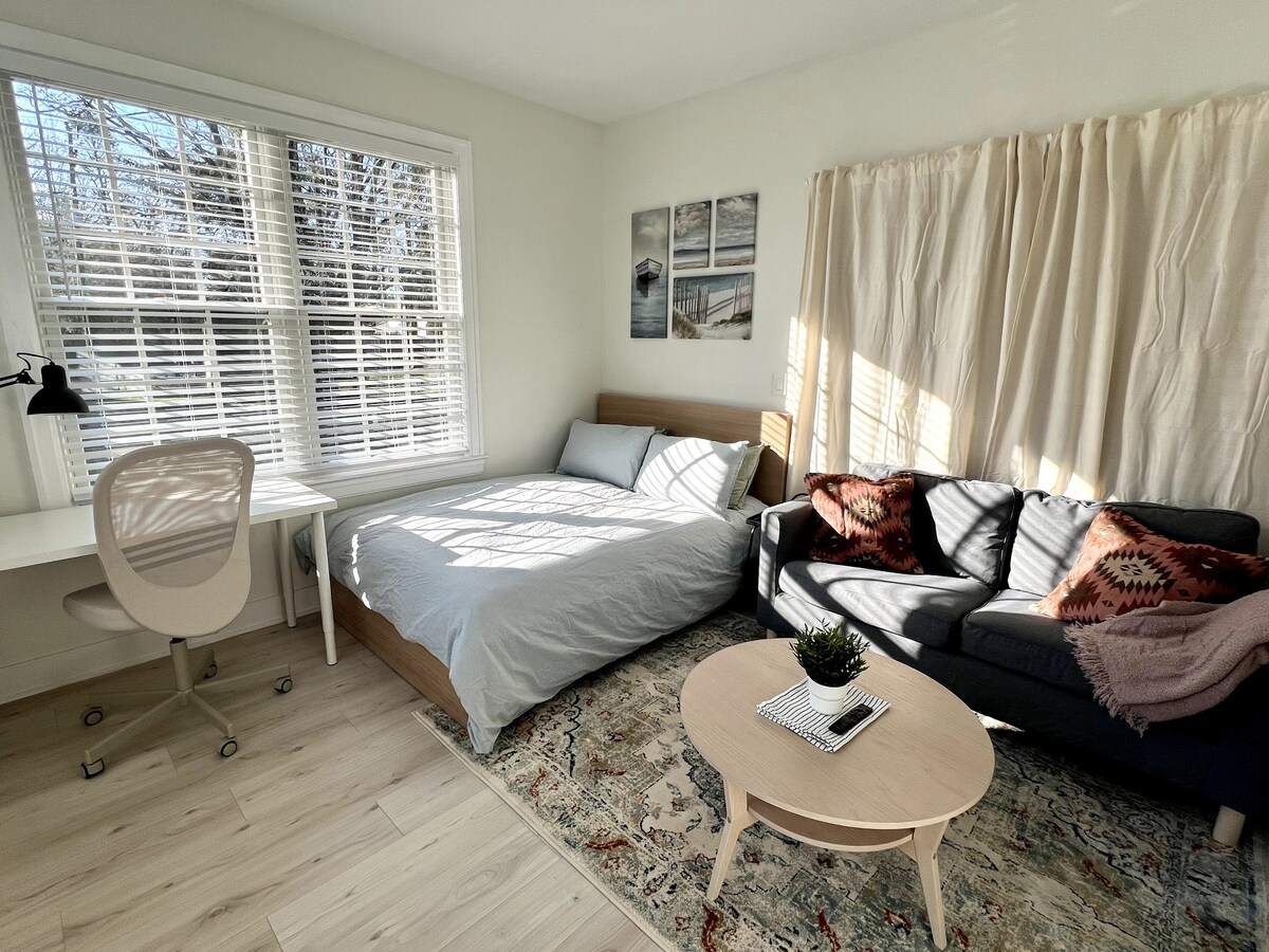 Esta suite con entrada independiente recién construida ofrece una comodidad acogedora y limpia. Tiene 250 pies cuadrados de espacio, pero está perfectamente distribuido para que todo lo que necesites esté allí sin sentirte abarrotado. Muchos de nuestros huéspedes vienen para pasar un fin de semana tranquilo y relajante o para trabajar a distancia en un lugar acogedor. Vivimos en la casa adjunta, pero el espacio que estás alquilando es completamente privado, con entrada privada y sin espacios compartidos. Hay una pared de ladrillo entre los espacios, ¡así que no te oiremos y tú no nos oirás!