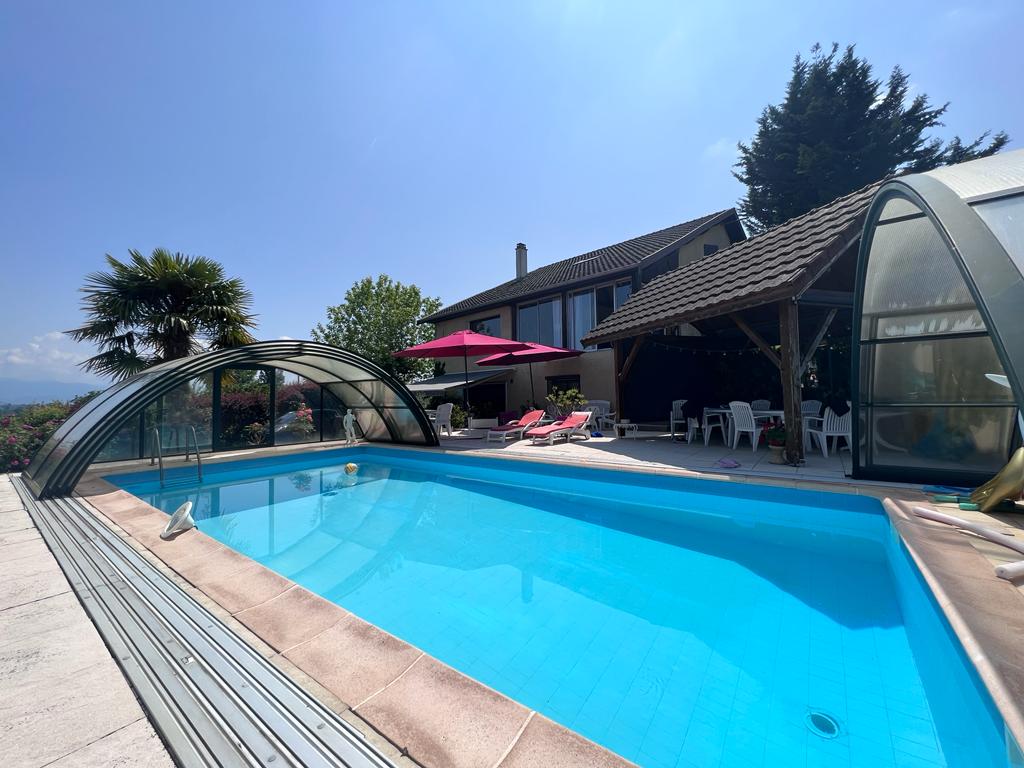 Gran casa con magníficas vistas panorámicas a las montañas. Ideal para una estancia en familia o con amigos. La casa está dividida en 2 partes independientes, usted se beneficiará de la casa principal con el primer nivel, entradas, lavandería, cocina, sala de estar, terraza y WC. Arriba, un salón en el entresuelo con un gran sofá y TV, 3 dormitorios, baño con inodoro y un gran balcón. En el exterior, tiene una terraza privada en frente de la casa. Lado del jardín, una terraza y una piscina