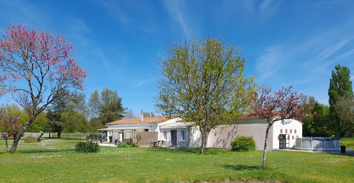 En el corazón del triángulo Royan-Saintes-Rochefort, descubre un tranquilo refugio rural a solo 25 km de las playas. Esta espaciosa casa de campo de 110 m² se encuentra en una finca vinícola del siglo XIX de 2 hectáreas. Disfruta de tu terraza privada y jardín cerrado. Desde mediados de abril hasta principios de octubre, date un chapuzón en la piscina de agua salada climatizada a 27 °C, compartida con solo otros dos huéspedes. Un verdadero paraíso para los amantes de la naturaleza y la tranquilidad.