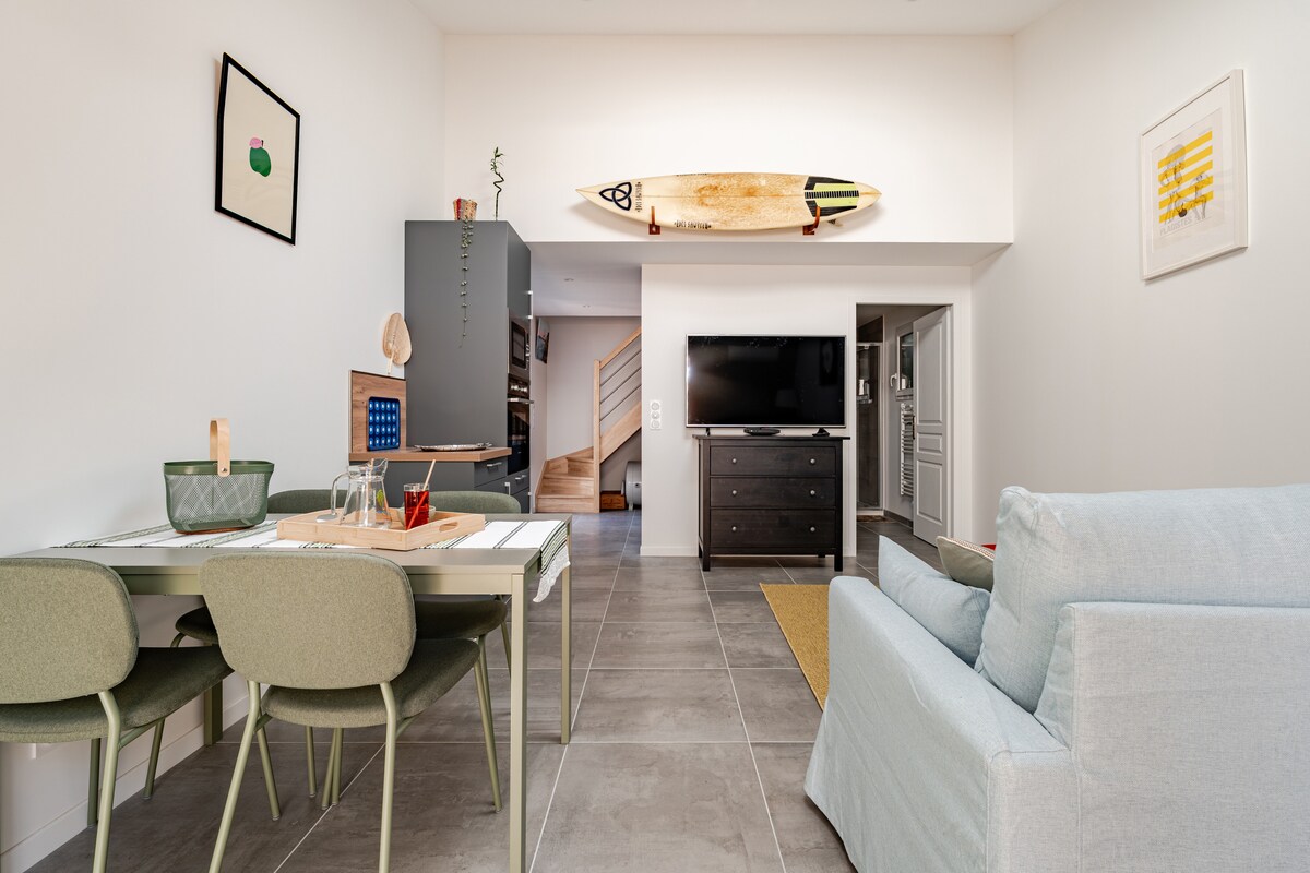 Casa nueva de 90 m2, 8 camas arriba, 1 baño en la planta baja y 1 cuarto de baño en el dormitorio principal, 2 aseos TV+WI-fi+Netflix, cafetera de grano A 20 minutos de Burdeos, estadio Matmut, vinexpo y a 45 minutos de las playas y en la carretera de los castillos del Médoc En medio de los viñedos en 1 hectárea de jardín Barbacoa tradicional + plancha y piscina 10x5 m compartida con los propietarios si están presentes. El spa/jacuzzi estará reservado para usted. A 200 metros a pie del antiguo pueblo de Ludon-Médoc y de todos sus comercios