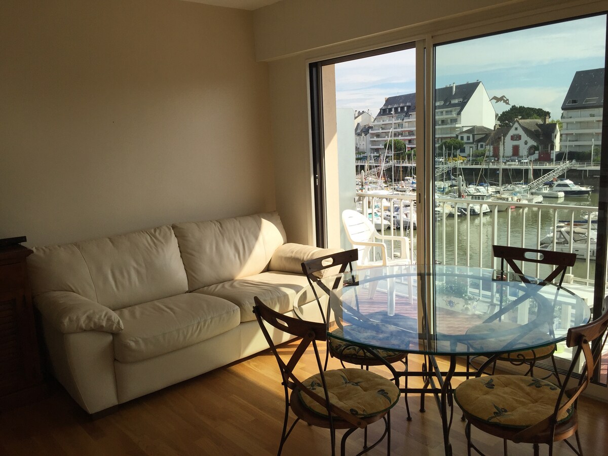 T2 transformé en grand studio (cloison abattue). L'avantage est de bénéficier de 2 grandes baies vitrées avec vue directe sur le port du Pouliguen-la Baule. Pas de vis à vis. Les commerces sont dans un rayon de 100 m (boulangerie, boucherie, marché, petite superette). Plage à 200 m. Garez votre voiture et faites tout à pied ou à vélos (2 vélos prêtés) Place parking privée à 300 m Lit escamotable grand confort (vrai lit, excellente literie)