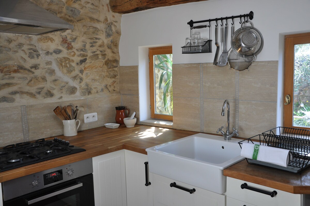 En la plaza de la iglesia, a 5 metros por encima del hermoso paisaje de colinas hasta donde alcanza la vista. Auténtica masía, construida sobre una roca, con vistas a la garriga. Ventanal y terraza con vistas panorámicas. Todo confort. Con mobiliario cuidado. Autónoma. Tranquila y plena naturaleza. Pequeña terraza cubierta en la bonita plaza de la iglesia, sin vecinos. En Felluns, 50 habitantes, en el corazón de Fenouillèdes. Entre el mar, los Pirineos y el País Cátaro. Salida de senderismo desde la casa.