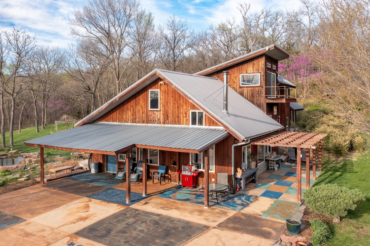 Wrap yourself in nature and luxury in the enchanted hills of Tonganoxie, overlooking Nine-Mile Creek Valley. This forested designer sanctuary features 3,500 sqft - 3 bedrooms and 3 bathrooms on 10 secluded acres. Dive into the mystical waters of a natural swimming pool, sleep in regal king beds with the finest linens. Relax in three spacious living rooms. The kitchen, fit for a culinary wizard, awaits your gourmet creations. This land has healing properties - ground out, reconnect, recharge.