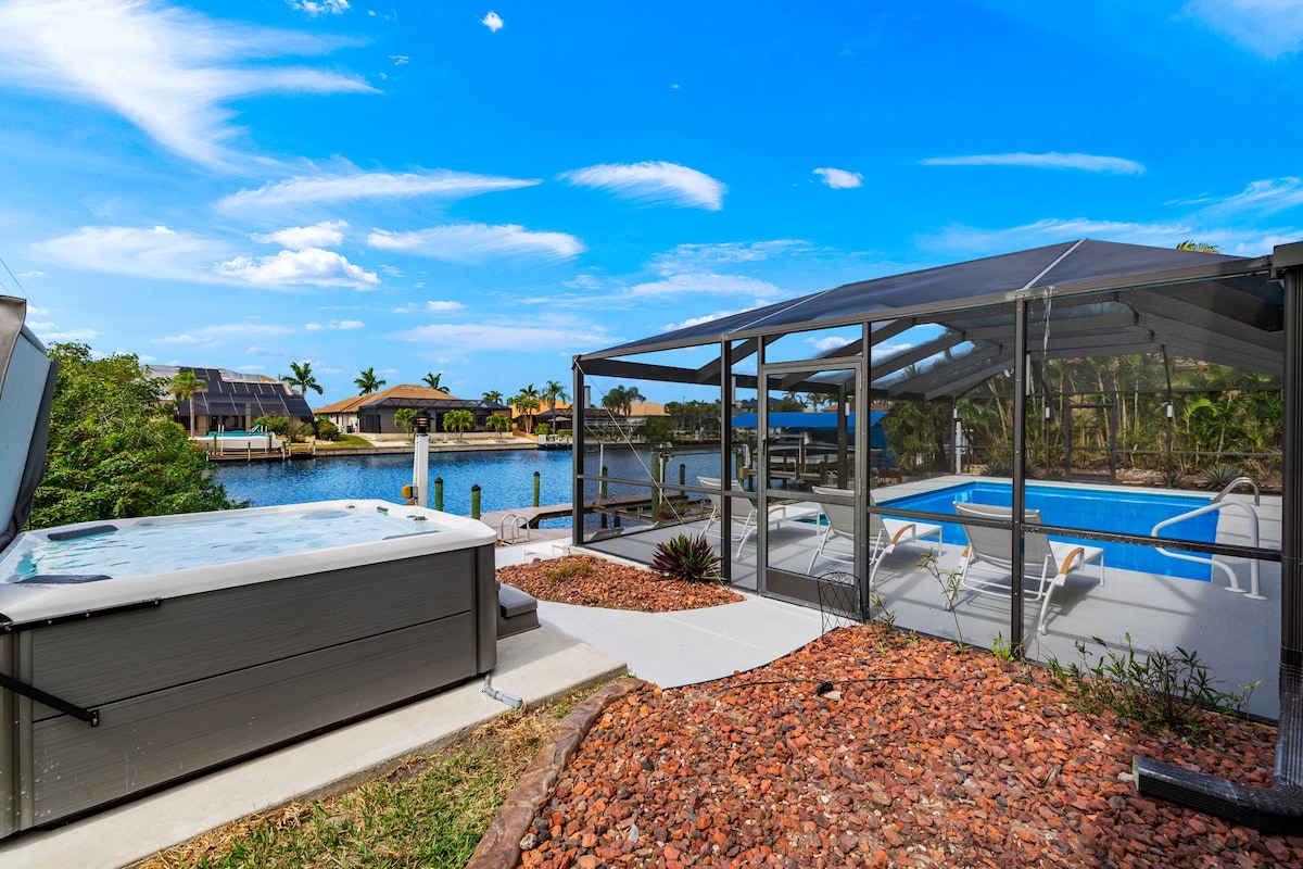 ¡UNO DE LOS MEJORES PASEOS MARÍTIMOS DE CAPE CORAL! A pocos pasos de la playa. Esta casa de más de 2500 pies cuadrados tiene impresionantes puestas de sol y vistas al agua del suroeste desde todas las salas de estar principales, así como desde la suite principal. Piscina climatizada con iluminación LED de colores, spa incorporado, baño de piscina, lavandería completa, Lanai, chimenea, wifi y televisores en cada dormitorio, muelle privado. Barco en elevador para alquilar con alquileres RPM. Amplio garaje para 2 coches con 5 bicicletas, carro de playa y nevera en el sitio.