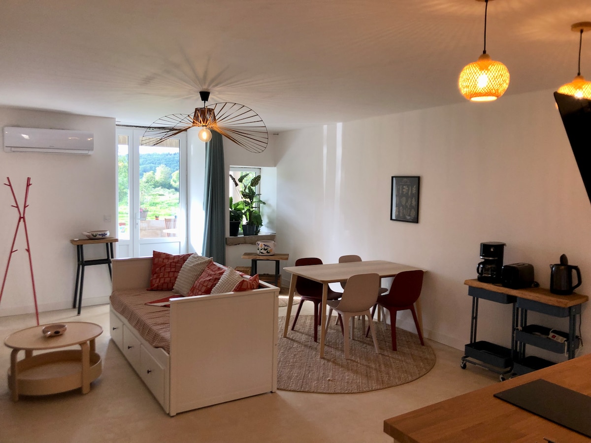Idealmente situado entre Franche-Comté y Borgoña, apartamento dúplex, que consta de una cocina equipada, un baño, un inodoro seco, una sala de estar y un dormitorio. Este alojamiento está situado en una casa unifamiliar, rodeada de una propiedad de 1,5 hectáreas, a orillas del río. Si te gusta la naturaleza, los grandes espacios y la tranquilidad del campo, no lo dudes más... Se admiten animales, posibilidad de alojamiento y pasto para caballos y burros.