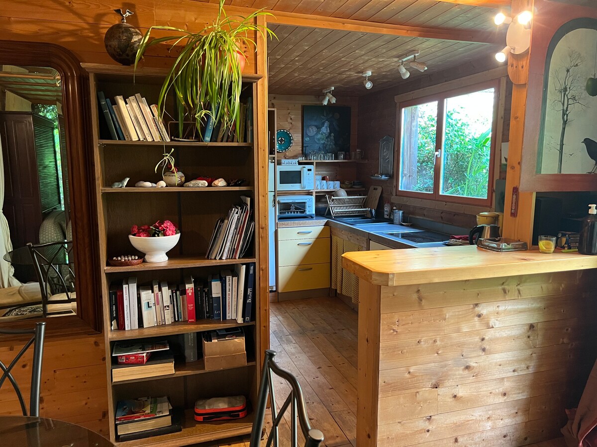 Encantador chalet de madera cerca de todos los comercios y a unos 10 minutos en coche de las hermosas playas de la costa de Lorient. Este alojamiento con una superficie de 22 m2 situado en la parte trasera de nuestra casa sin vecinos está compuesto por una habitación principal con zona de noche; cama doble 140 x 190 cm, una zona de cocina equipada y un cuarto de baño con ducha a ras de suelo, lavabo e inodoro Dispone de terraza y pérgola
