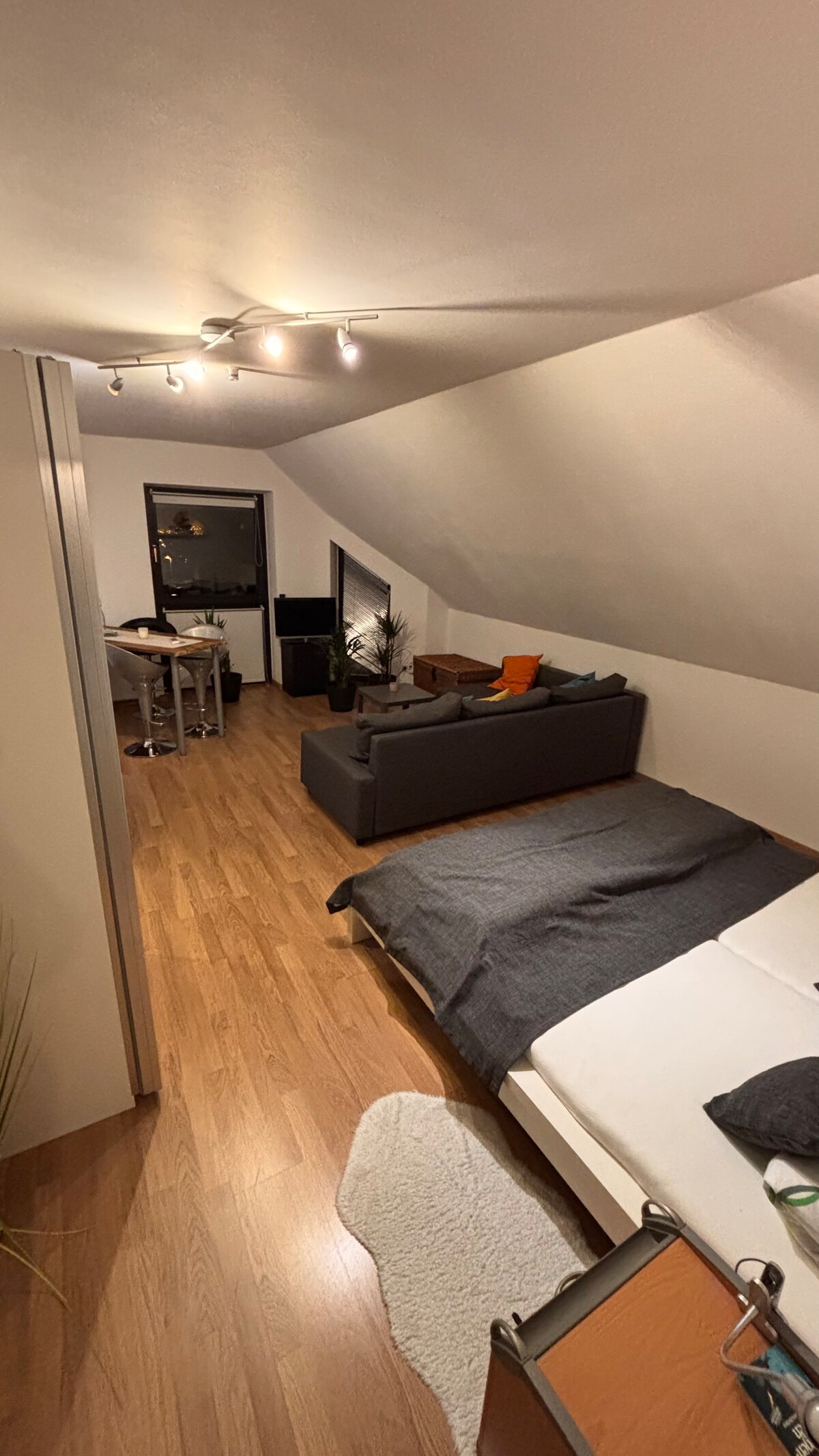 Un ático luminoso y cómodo en el cuarto piso lleno de arte original de tu anfitrión. Piso privado completo con acogedora zona para dormir y pequeño baño con ducha separada. A solo 5 minutos a pie de la estación de tren de Opladen y a 16 minutos en tren de Colonia (Köln Hbf). Cafés y tiendas cercanas a pie. Nota: No hay cocina, lo que hace que el espacio sea perfecto para estancias cortas. Hay un microondas disponible en la habitación. La escalera se comparte con otros departamentos, todo el piso del ático es privado para tu estancia.