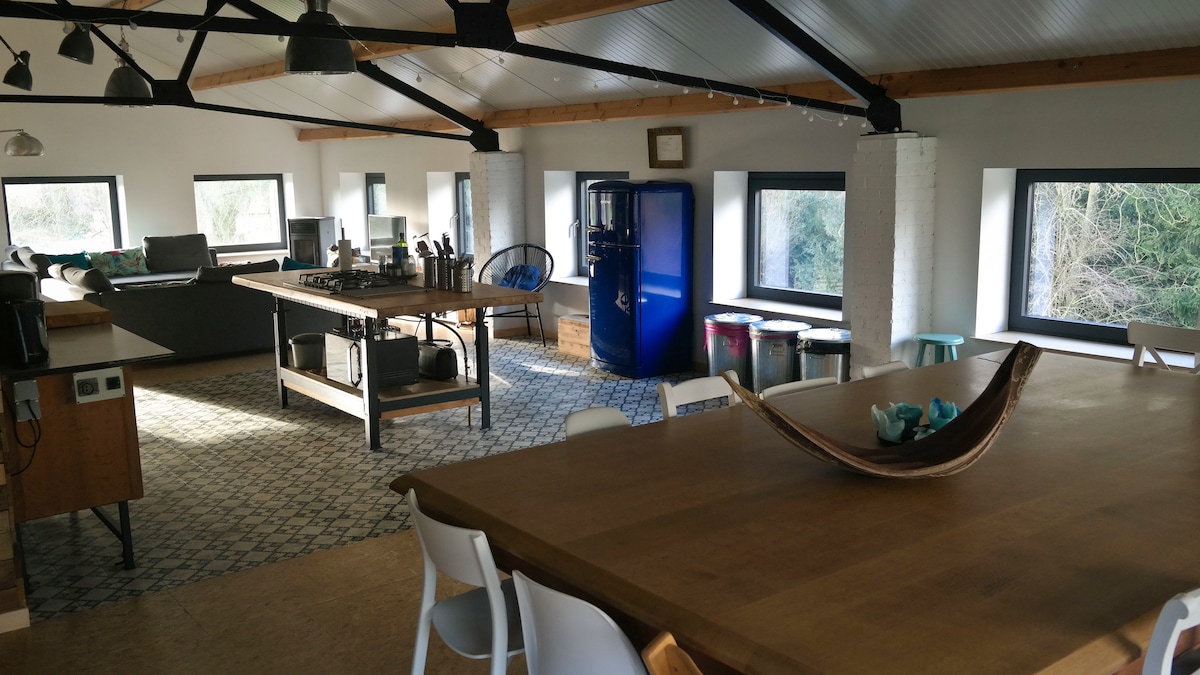 Es un gran LOFT (140 m2/una habitación grande) con mucha luz situado en un pequeño pueblo rodeado de campos, naturaleza y silencio. Es muy adecuado para relajarse y pasar un buen rato entre familiares o amigos. Pero NO es un lugar para fiestas. La zona es muy conocida por sus flores. Las estaciones de autobús y tren están cerca. Tenemos 4 camas dobles arriba en el loft. Se puede añadir una cuna. Hay una mesa de ping pong, futbolín y un PACMAN Arcade abajo en la cueva del hombre (cueva de la mujer). Tenemos dos perros geniales: Lou y Daisy.