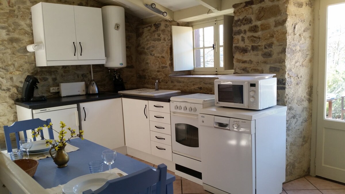 La casa rural linda con nuestra casa y está situada en un entorno verde a los pies de la Montagne Noire, a las afueras de un bonito pueblo cátaro. Además de un gran jardín, dispone de una plaza de aparcamiento vigilada. Esta casa rural de 35m2 consta de salón, cocina, cuarto de ducha y dormitorio. El apartamento tiene su propia entrada que da a una terraza cubierta con muebles de jardín y barbacoa. La casa rural se mantiene fresca en verano gracias a la vegetación.