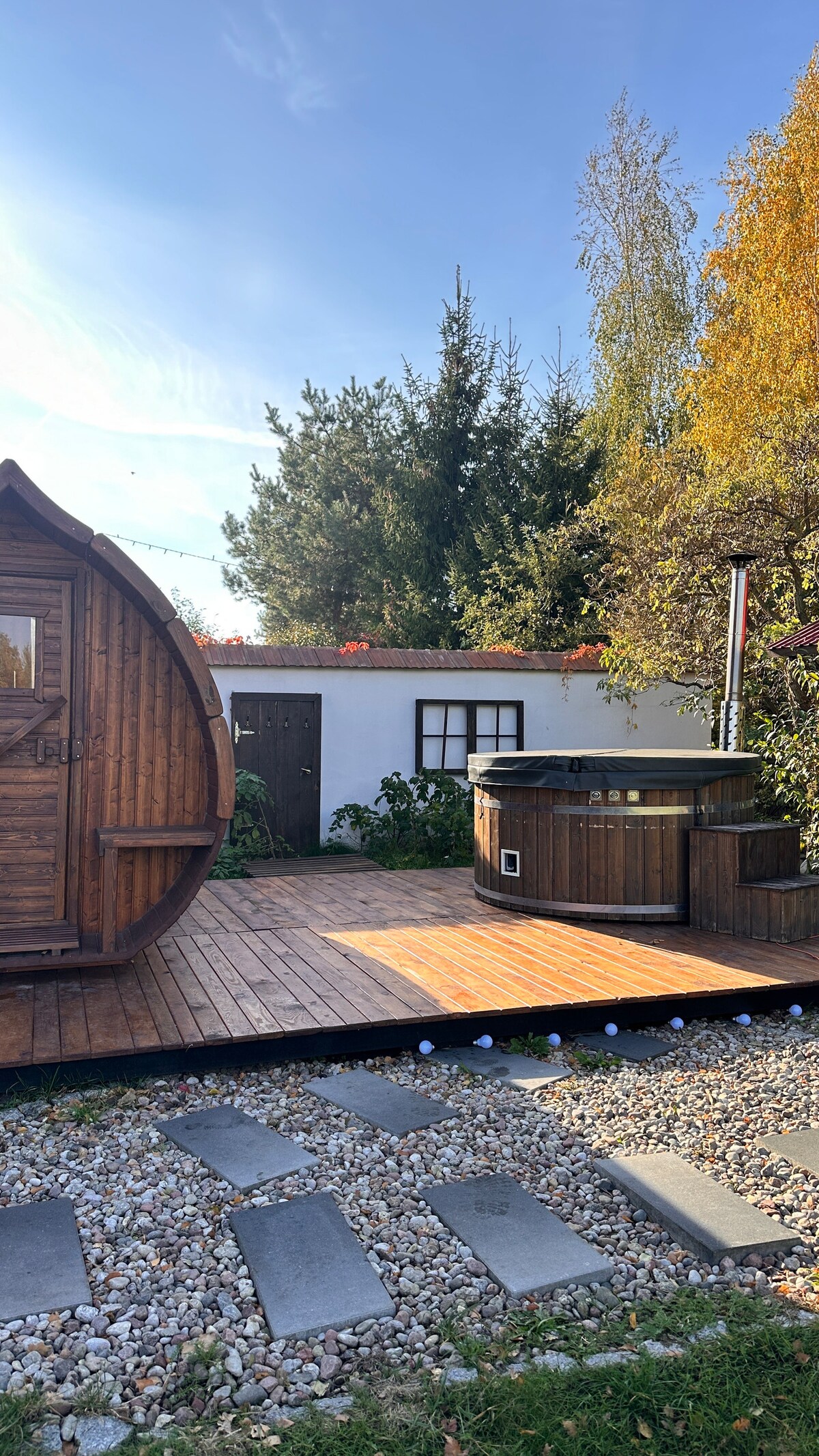 Casa de madera con bañera y sauna en las afueras