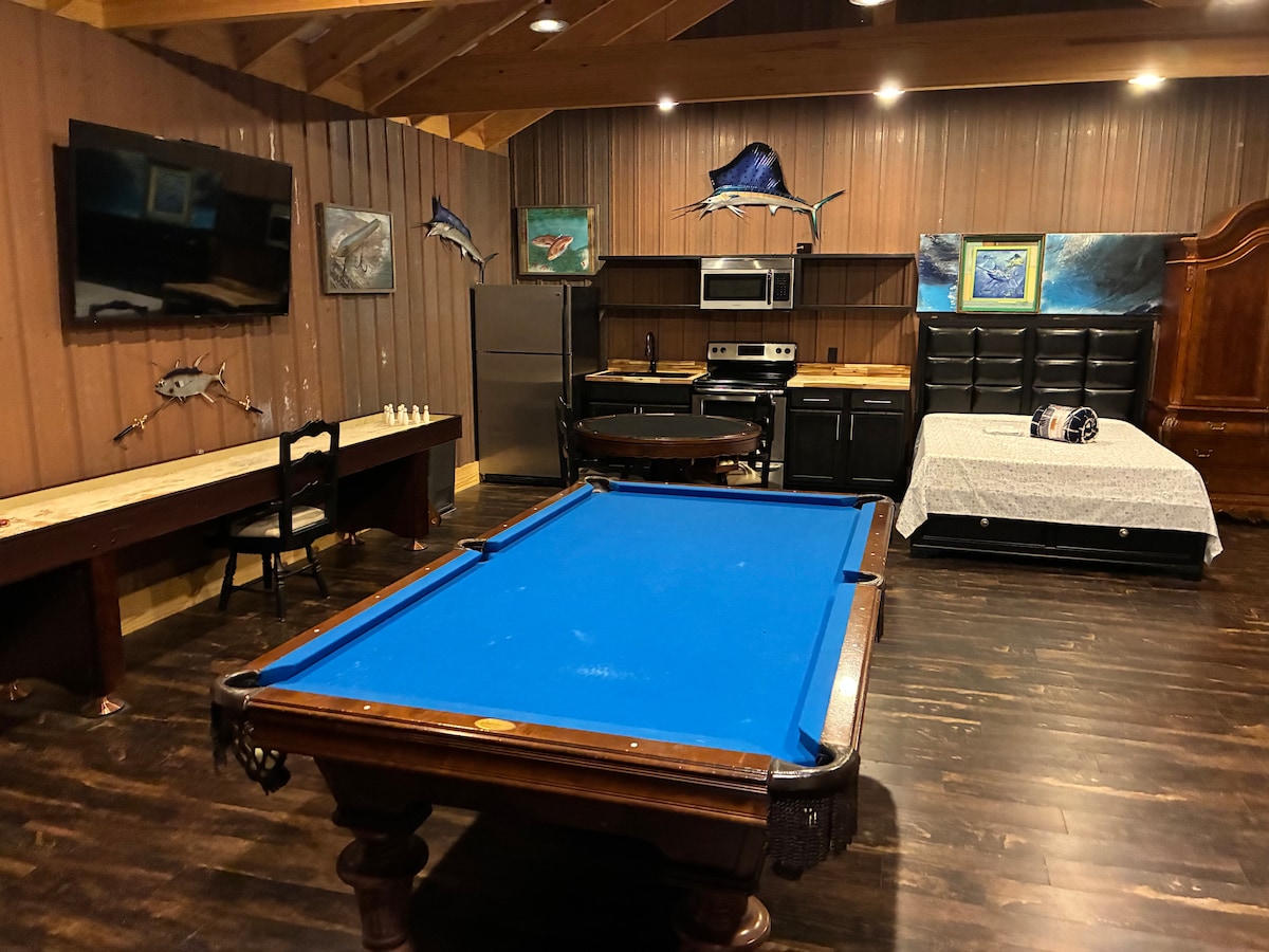 A dos millas de la interestatal, The Barn se encuentra en tres acres de propiedad privada tranquila. A medida que avanzas por nuestro camino, The Barn está a la izquierda de nuestra casa. Las señales de estacionamiento están claramente marcadas. El granero - Abajo es un apartamento de eficiencia de 600 pies cuadrados con una cómoda cama tamaño king, una cocina americana, una zona de estudio con un sofá cama tamaño queen, un baño con ducha y un Televisor de 55 pulgadas que gira. Las comodidades incluyen un patio, una parrilla de carbón, una chimenea, un estanque para pescar y un sendero natural.