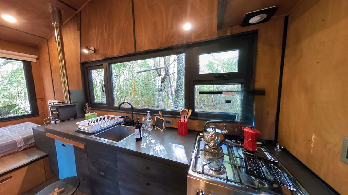 Tiny House con chimenea interior a orilla de río