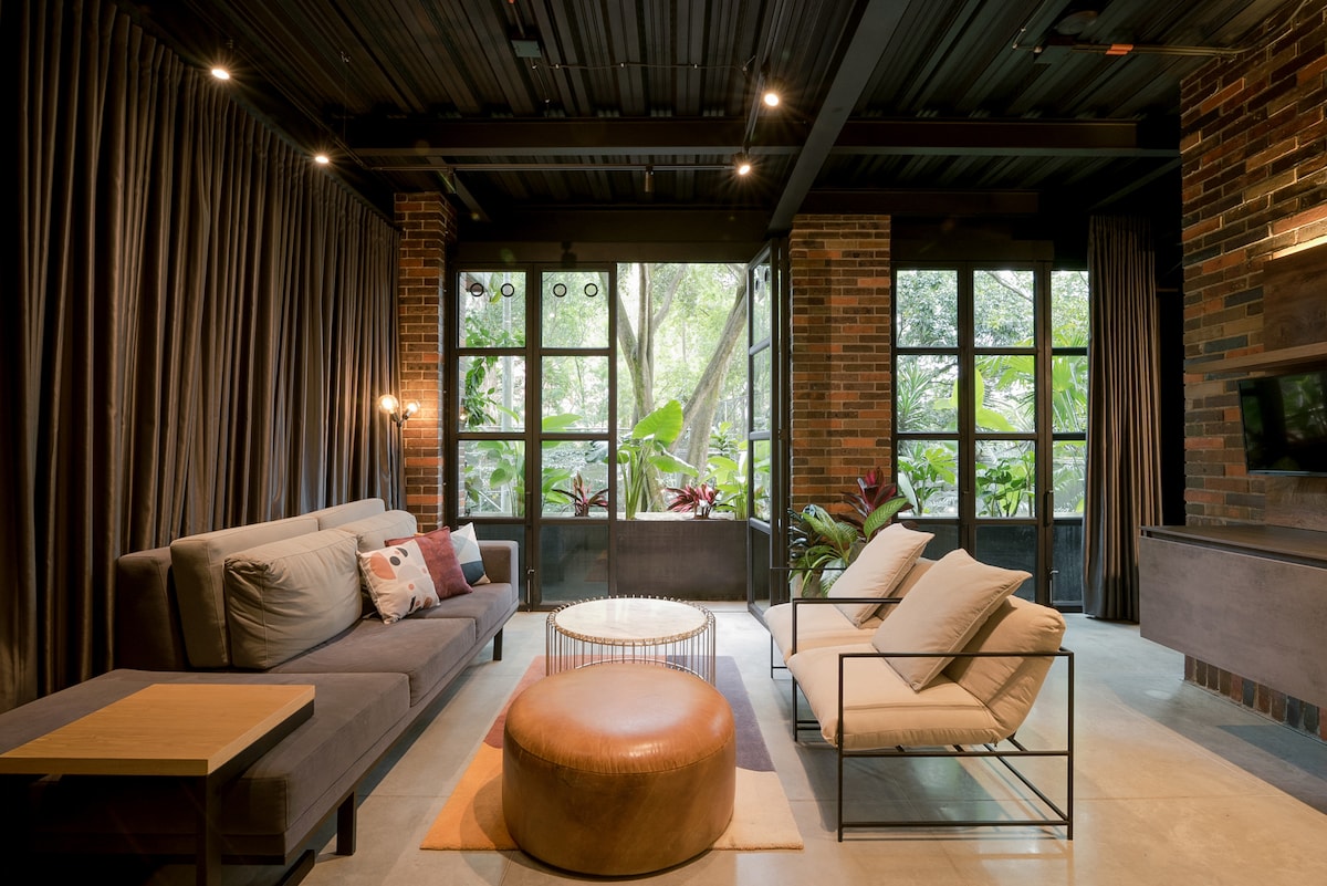 3450 Living is easy to spot among the trees in Laureles. Designed like the bow of a ship, the angular combination of glass, brick, black metal, and concrete is conveniently located. The relaxed atmosphere is perfect for young professionals, students, couples, digital nomads, or friends looking for a cost-effective space in a prime location. Four floors of modern-chic apartments feature expansive valley views from the balconies, residents also have access to the rooftop social area with jacuzzi.