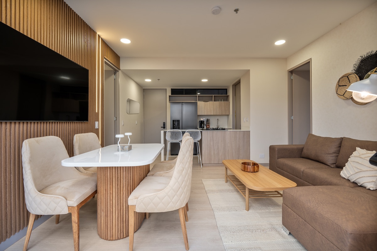 Book this stylish El Poblado apartment with pivoting smart TV, private balcony, A/C, high-speed Wi-Fi, dedicated workspace, fully equipped kitchen, washer/dryer, tea/coffee station, and 24/7 security. Enjoy a gym, swimming pool with city skyline views, co-working space, and access to a communal sun lounge/terrace. Within walking distance to Parque Lleras, bars, and nightlife — the ultimate retreat for luxury, style, convenience, and unforgettable Medellín moments.