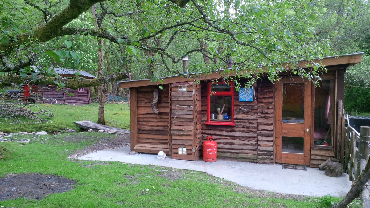 Una hermosa cabaña rústica en el bosque con zona de terraza cubierta y baño al aire libre. Es un refugio romántico con total privacidad. Sumérgete en el baño al aire libre y relájate con el sonido de los mirlos y las golondrinas antes del anochecer y los búhos después del anochecer. Luego sube a tu cabaña y experimenta la comodidad de tu cama doble, con ropa de cama encantadora para darle un poco de lujo a tu experiencia glamping. Pasa tiempo con esa persona especial sin ninguna interrupción del mundo exterior.