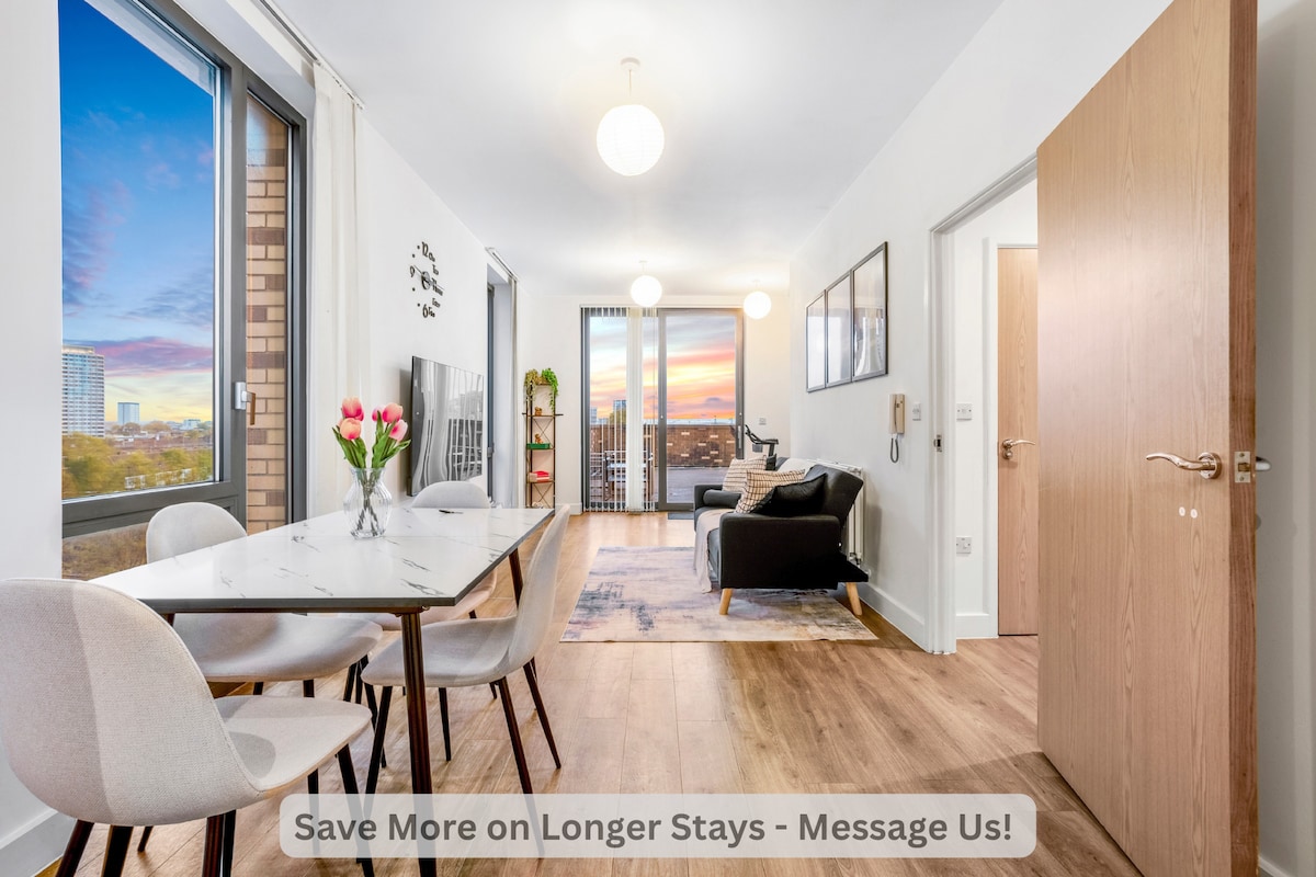 Este apartamento luminoso, espacioso y moderno tiene todo lo que necesitas para alojarte o trabajar a distancia... ...y también está en el barrio súper fresco, animado y cultural de Fish Island/Hackney Wick y cerca de ríos, canales y parques. Cerca del Estadio Olímpico, Copper Box Arena, Abba Voyage, y un montón de bares, cafeterías y restaurantes geniales, puedes divertirte aquí con amigos y familiares. Bien conectado con el tren, la superficie, el metro y los autobuses, también es una gran base para explorar el East End o todo Londres.