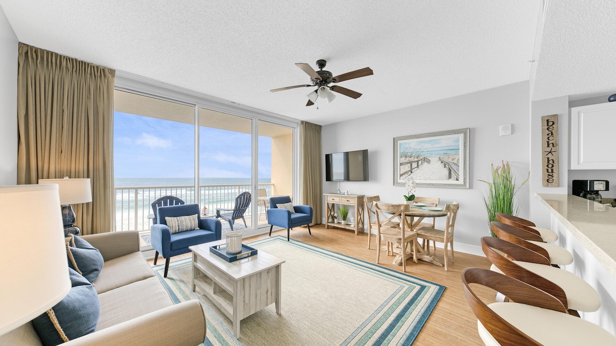¡SERVICIO GRATUITO DE SILLA DE PLAYA! Del 15 de marzo al 31 de octubre. 2 sillas de playa lounge y una sombrilla grande (valor de $ 45 por día) JUSTO EN LA PLAYA (NO AL otro lado DE LA calle). ¡Debes tener 21 años para reservar! Vivienda en el piso 11 *Piscina climatizada * 1er dormitorio: 1 cama queen Segundo dormitorio: 2 camas queen. Sofá cama tamaño queen con colchón de espuma 2 baños completos Capacidad para 8 personas ¡Increíbles vistas al mar desde la sala de estar y el maestro! WIFI GRATUITO Televisores INTELIGENTES en la SALA DE ESTAR y las HABITACIONES Cable incluido Restaurantes y tiendas al otro lado de la calle Walmart a dos cuadras de distancia