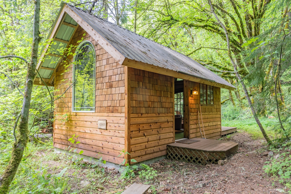 Cozy, clean, quiet getaway from the city: river-front cabin near Mt. Rainier NP. Sleeps/service for 4. Full kitchen. Wi-fi. Outdoor 4-person sauna. Fire pit. Artists welcome. Many hand-made touches for inspirational feel. Private Paradise Estates community, with pond, fishing, park nearby. Close to hiking, fishing, climbing. Local dining and services within 3 miles. 2 parking spaces near cabin, no street parking, no trailers, please. Outdoor outlet (110v) available for electric carcharging.