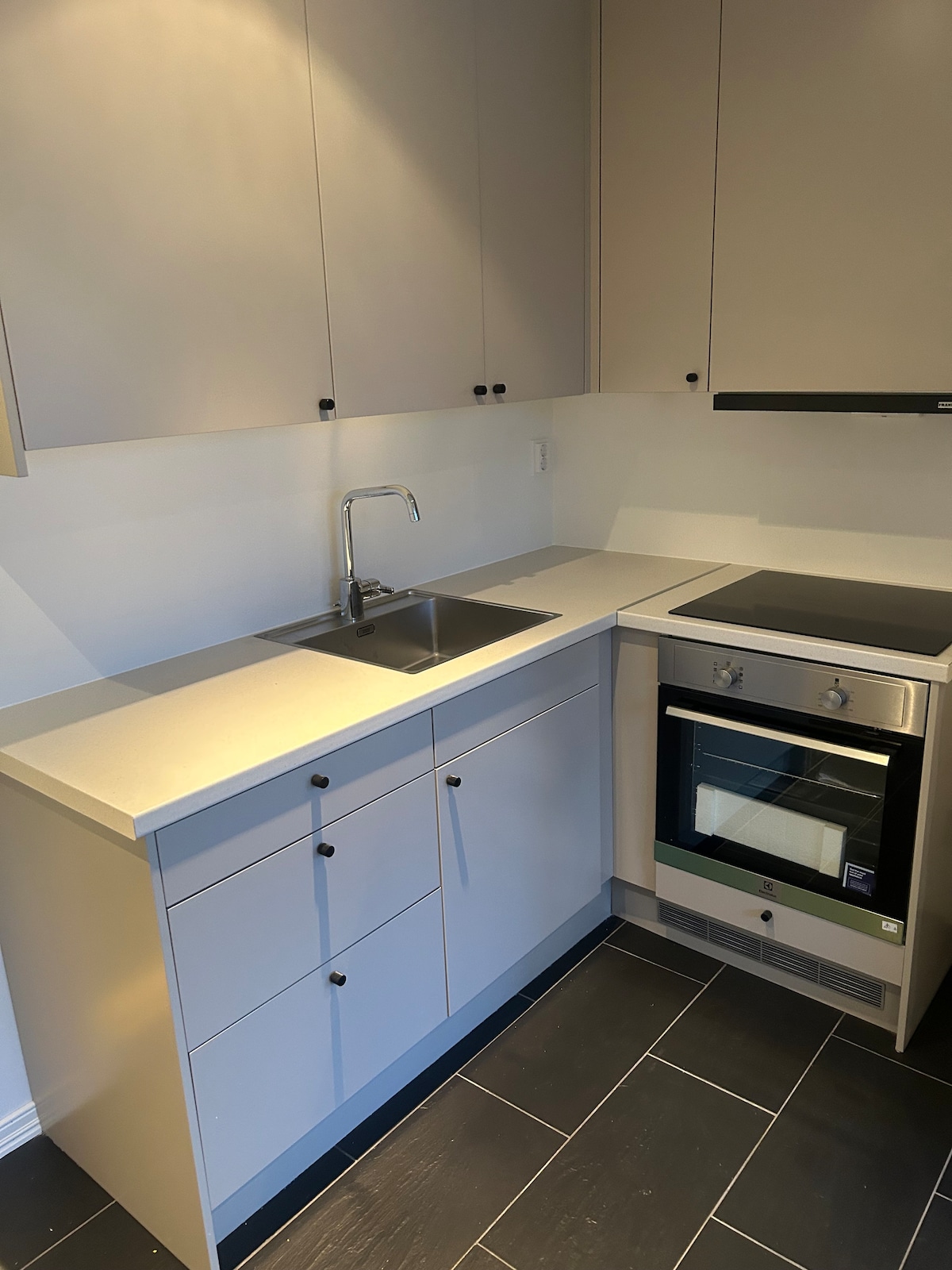 Studioleilighet med sovesofa, eget kjøkken og bad.