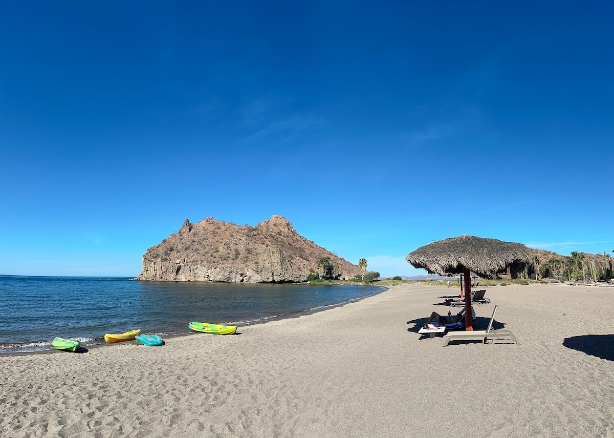 Nuestro moderno edificio APT tiene WiFi de alta velocidad y está a pocos pasos de la playa a lo largo del mar de Cortés. Este apartamento de dos dormitorios tiene aire acondicionado, amplio espacio de estar, perfecto para hasta 6 personas (con un sofá cama en la sala de estar). Un barrio tranquilo de hermosas casas de playa hace que el paseo a lo largo de nuestra playa sea seguro y seguro, a poca distancia de las palapas y el puerto deportivo. Monta en bicicleta o camina a lo largo de la playa para visitar el Malecón, la Plaza y la Misión. Descubre por qué Loreto es conocido como "Pueblo Mágico" (un pueblo mágico)