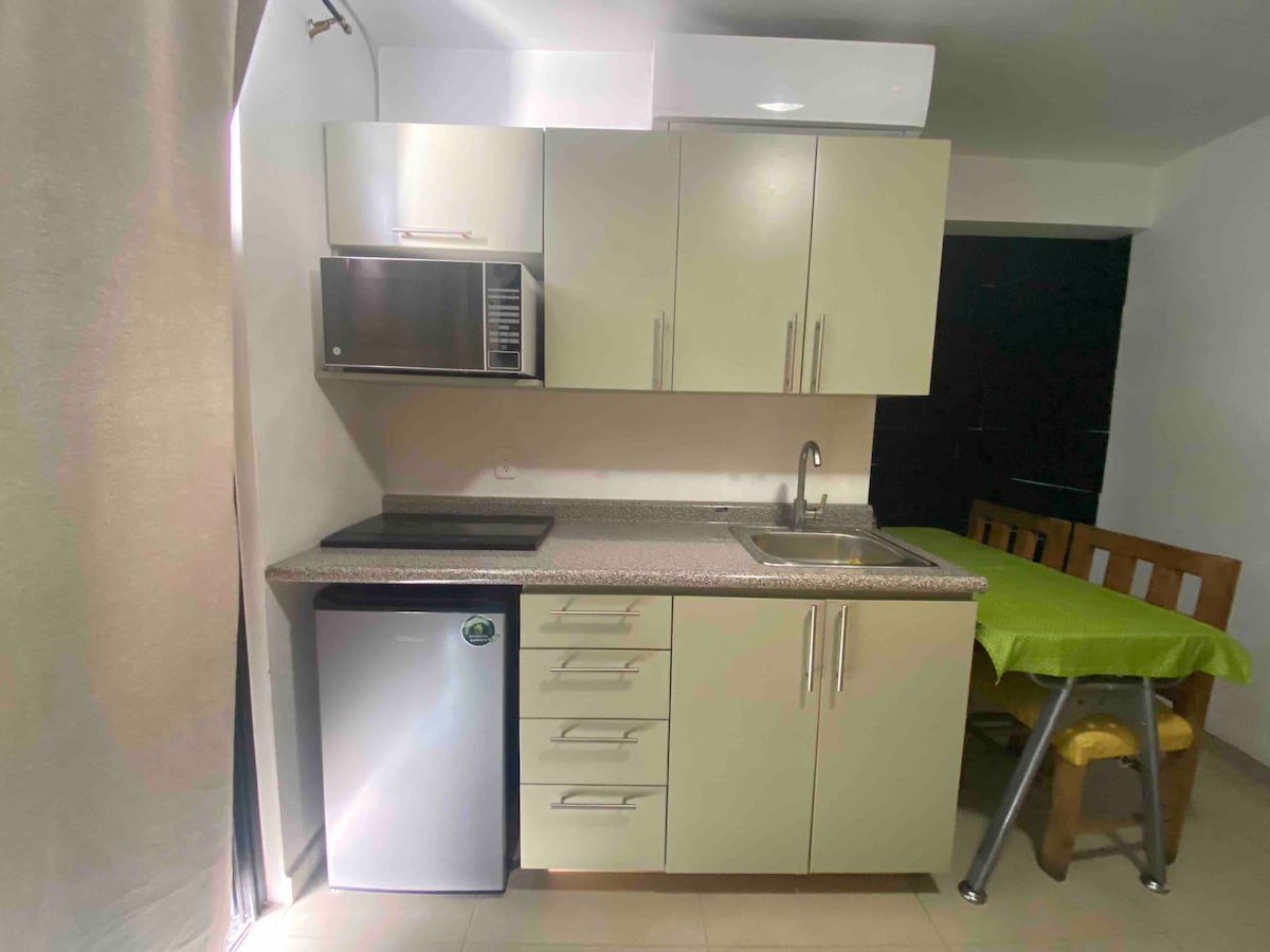 - Acogedor y exclusivo estudio ejecutivo con cama queen-size, escritorio y aire acondicionado. - Balcón para tomar aire fresco. - Cocina equipada. - Ingreso con cerradura inteligente y clave personalizada y exclusiva para cada huésped. - Rooftop panorámico con restaurante en el nivel 9. - Sala de juntas equipada para reuniones profesionales (consultar disponibilidad). - Acceso 24/7 con código personalizado. IMPORTANTE: No contamos con estacionamiento privado dentro de la propiedad.