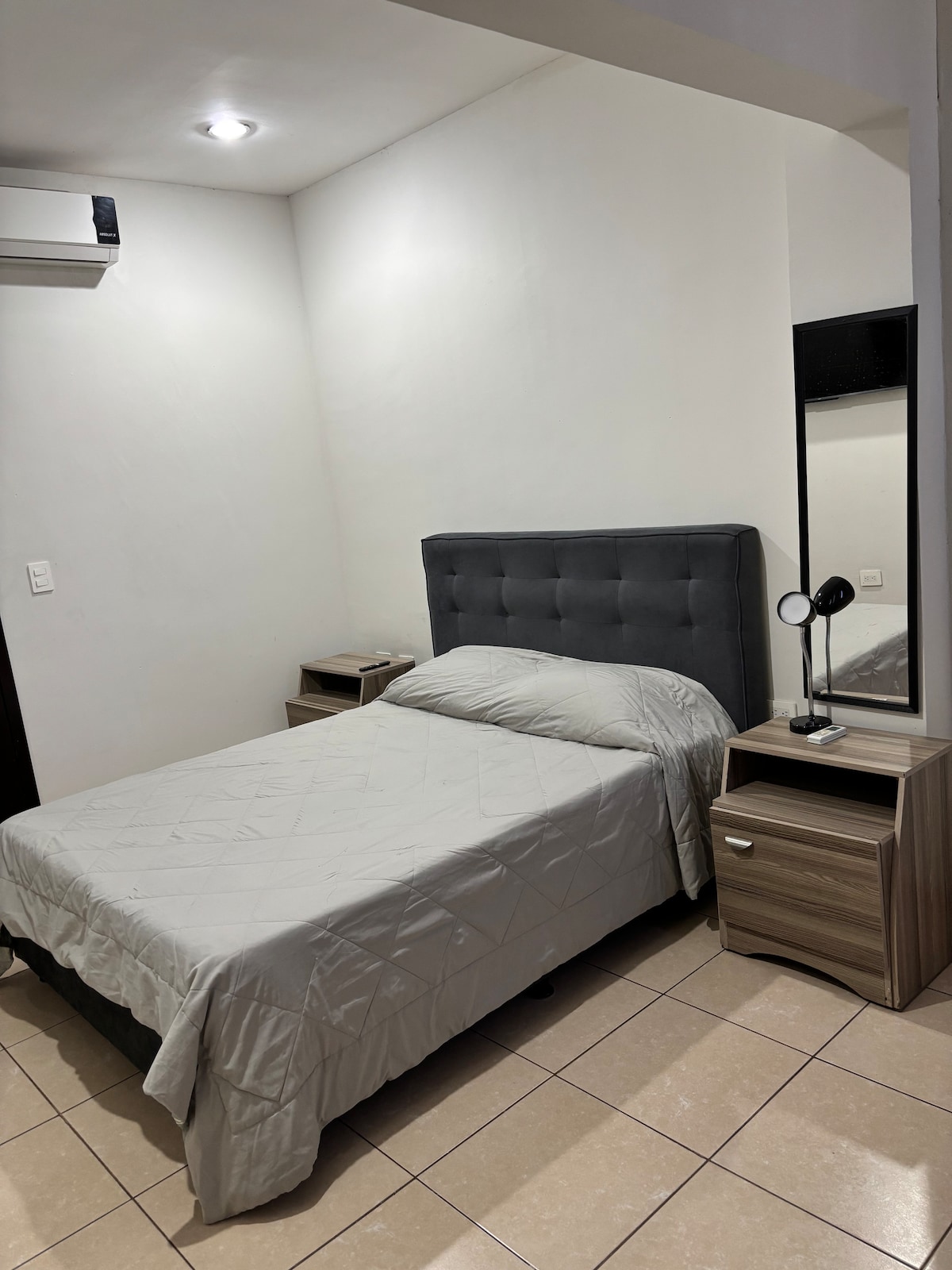 Disfruta de este alojamiento en planta alta. Acogedor, tranquilo y céntrico. Cuenta con una recamara matrimonial con aire acondicionado , pantalla de TV, cajonera, closet y baño privado, otra habitación con cocineta, refrigerador, parrilla eléctrica, barra central, 2 sillas altas y balcón.