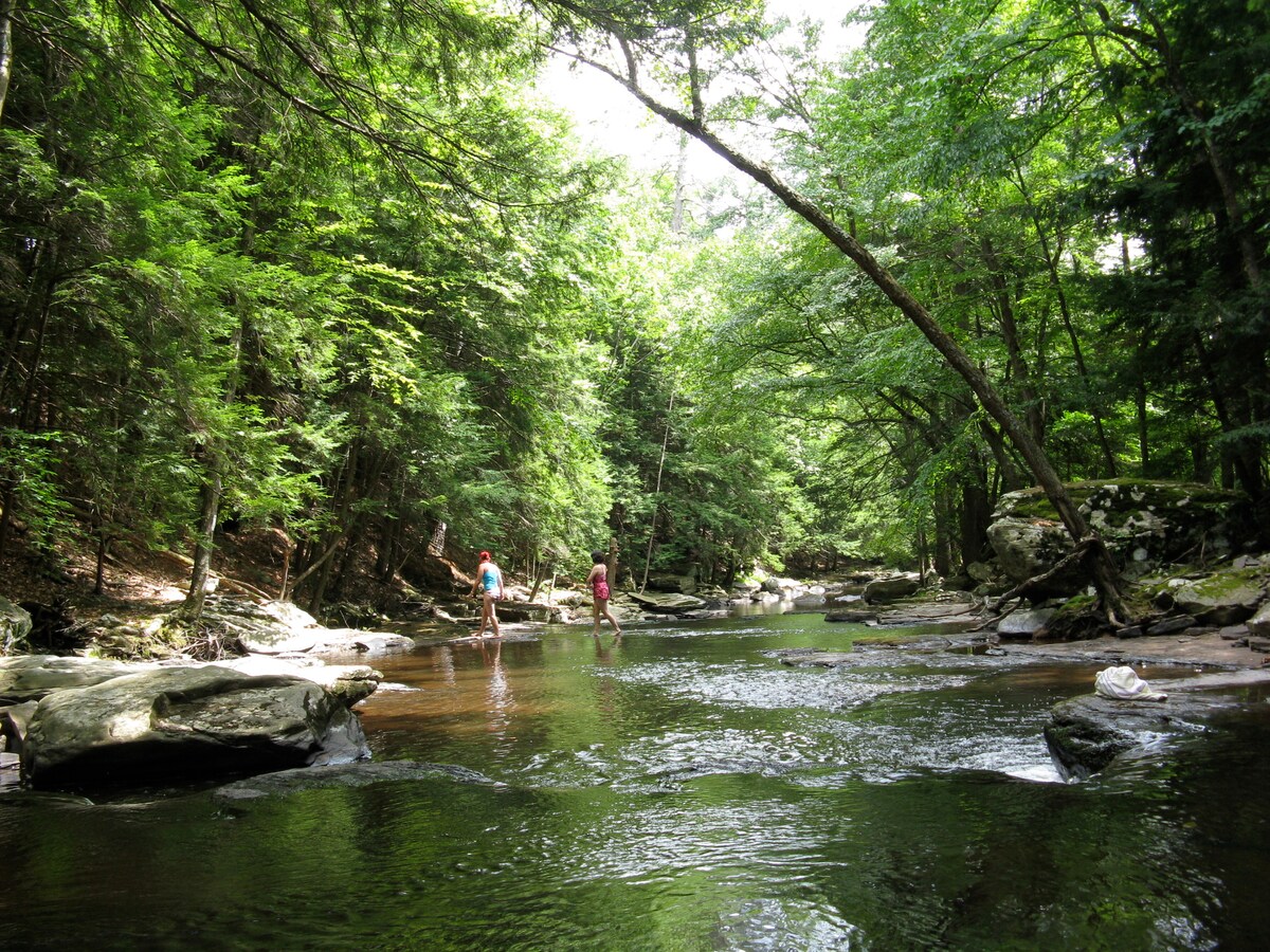 Unwind and reconnect with nature in this rustic and comfortable retreat nestled at the edge of a blueberry field. Surrounded by serene Catskills countryside, you’ll feel a world away, yet still be just minutes from outdoor activities, a thriving food scene, and Bethel Woods just 35 min away. Inside, you’ll stay cool with AC, a cozy queen bed, kitchenette, dining table, reliable wifi, and full bath. Outside, relax by the fire pit or cook on the charcoal grill. We are an LGBTQ+ inclusive space.