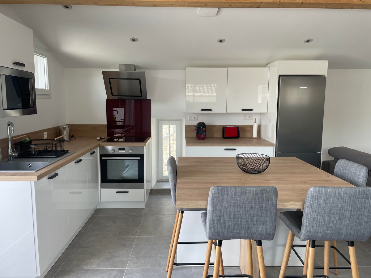 En un entorno tranquilo frente a los viñedos y al pueblo de Mirabel, venga a disfrutar de una bonita casa unifamiliar de 75 m2 con capacidad para 6 personas. La casa está totalmente equipada y tiene todas las comodidades. 2 habitaciones con camas dobles; Un sofá cama (colchón Simons 140x190) completa la ropa de cama. Cuarto de baño con ducha a la italiana. Una terraza a la sombra de un ciruelo y un jardín de 150 m2 le permitirán disfrutar del exterior y del spa inflable (de mayo a siete)