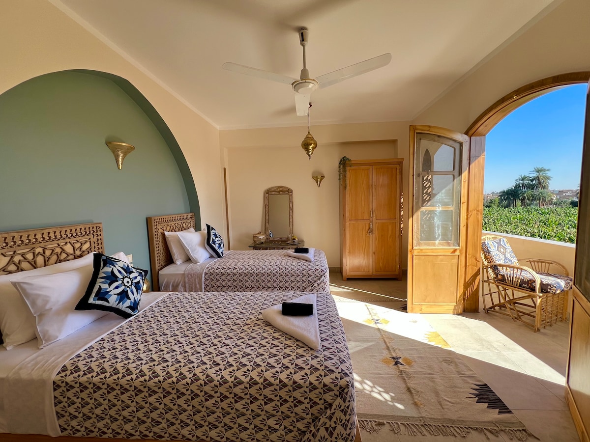 Beit El Hanna is the "House of Joy" in ancient Egyptian. It is the palace where the builder Pharaoh Amenhotep III once lived. Not far from Habu Temple, my family and I will host you in our home. A unique historical spot in a residential and quiet neighborhood surrounded by fields of wheat and sugarcane and a mountain overlooking the valley of the Queens.