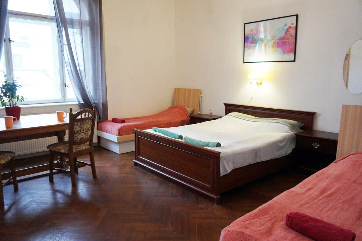 Amplia habitación doble para 4 personas con una cama doble grande y 2 camas individuales. ¡Situado en apartamentos cerca de la plaza principal!