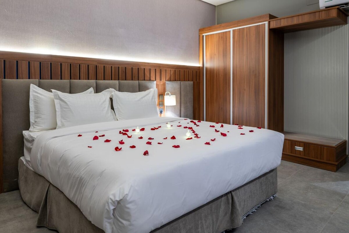 Disfruta con toda la familia en este elegante alojamiento. Apartamento moderno de lujo * Diseñado y equipado para su comodidad * Consta de dos habitaciones (master y habitación con 3 camas) Amplio salón abierto a la cocina moderna Diseño elegante (pantalla Samsung Smart WiFi) Cocina totalmente equipada - Frigorífico - Horno + microondas + lavadora - Todos los utensilios de cocina completos- - Fogones (gas/eléctricos) Además de la ubicación privilegiada A 8 minutos en coche de la estación de tren A 10 minutos en coche del aeropuerto A 5 minutos en coche de la mezquita de Quba A 15 minutos en coche de la Mezquita del Profeta